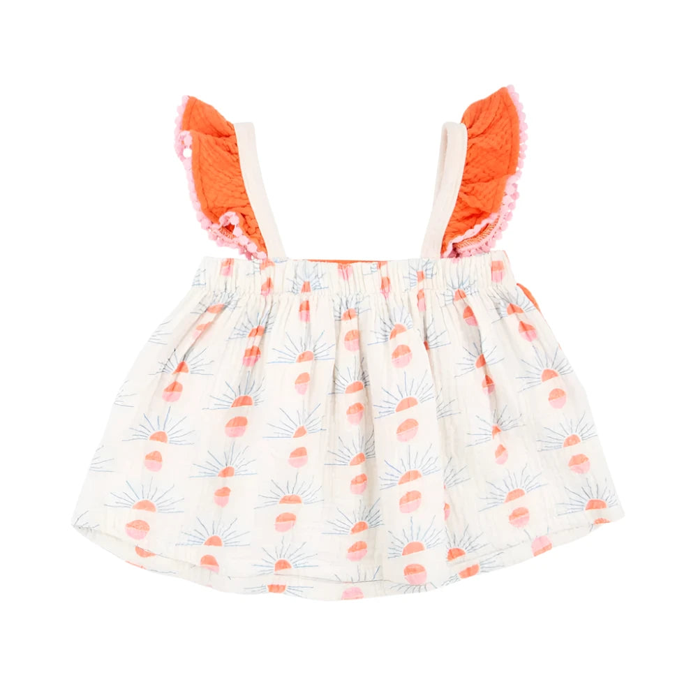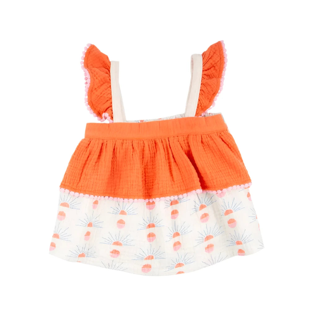 The Anya Tank - Western Sun is a stylish and playful top designed for girls, perfect for warm-weather days. This adorable tank features a tiered design with a mix of textures and patterns. The top layer is a vibrant orange crinkled fabric, adding a lively pop of color. The bottom layer is a soft, cream-colored fabric adorned with a fun sunset print, featuring warm-toned suns with blue rays.The flutter sleeves are accentuated with delicate pink pom-pom trim, adding a whimsical and charming touch. The adjustable cream-colored straps ensure a comfortable fit, making it ideal for everyday wear or special outings. This breezy and lightweight tank is perfect for keeping cool while looking effortlessly cute!