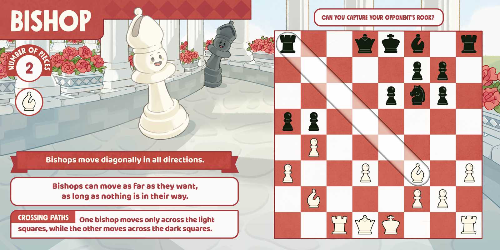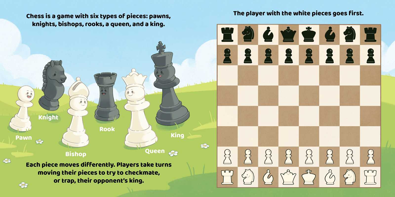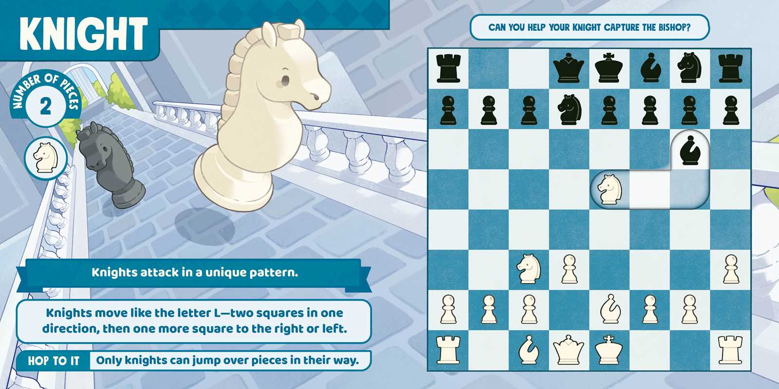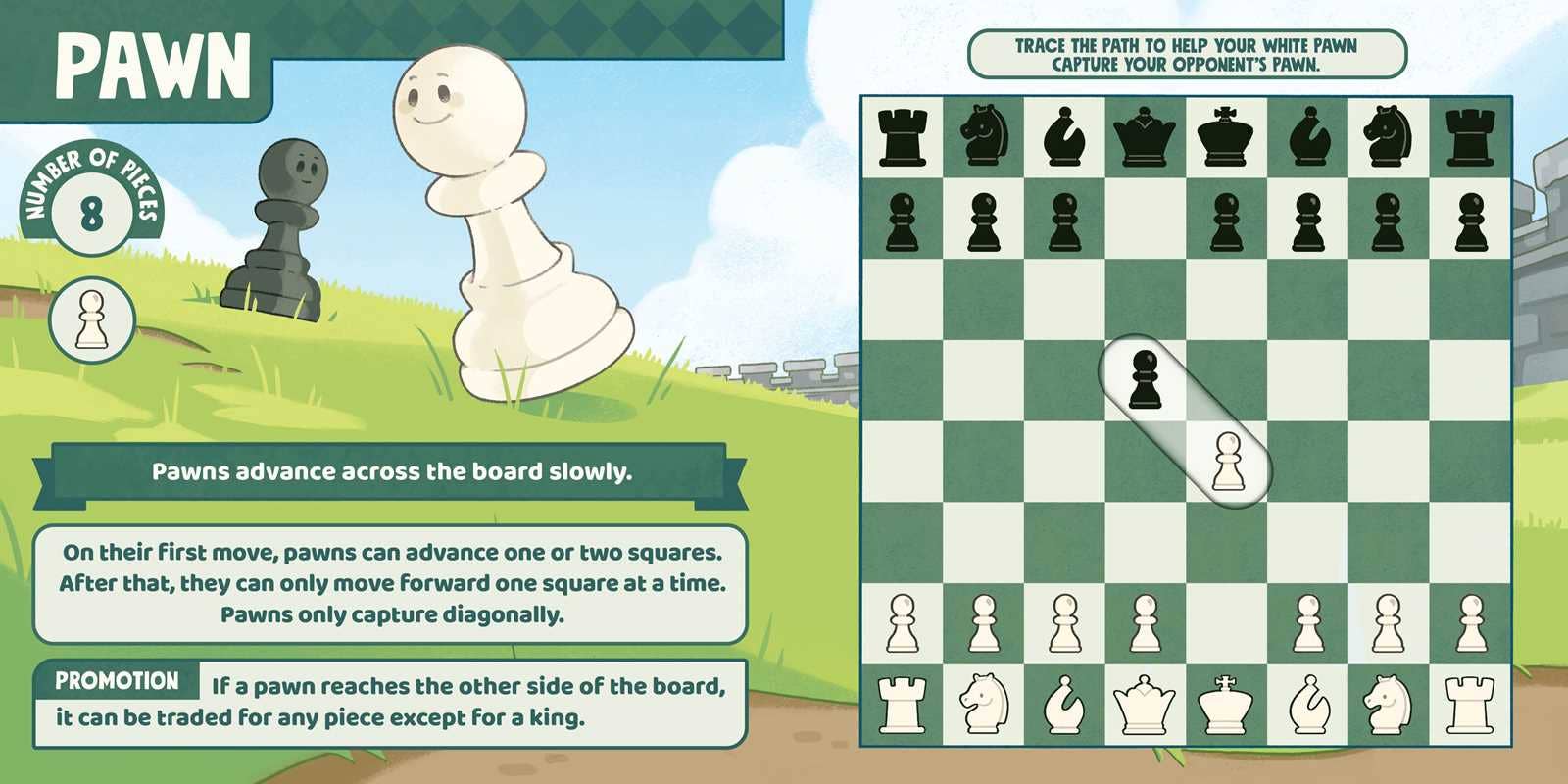 Place your finger in each page's traceable ridges to follow a pawn advancing toward the opponent's king or a rook sliding vertically to capture the opponent's knight.