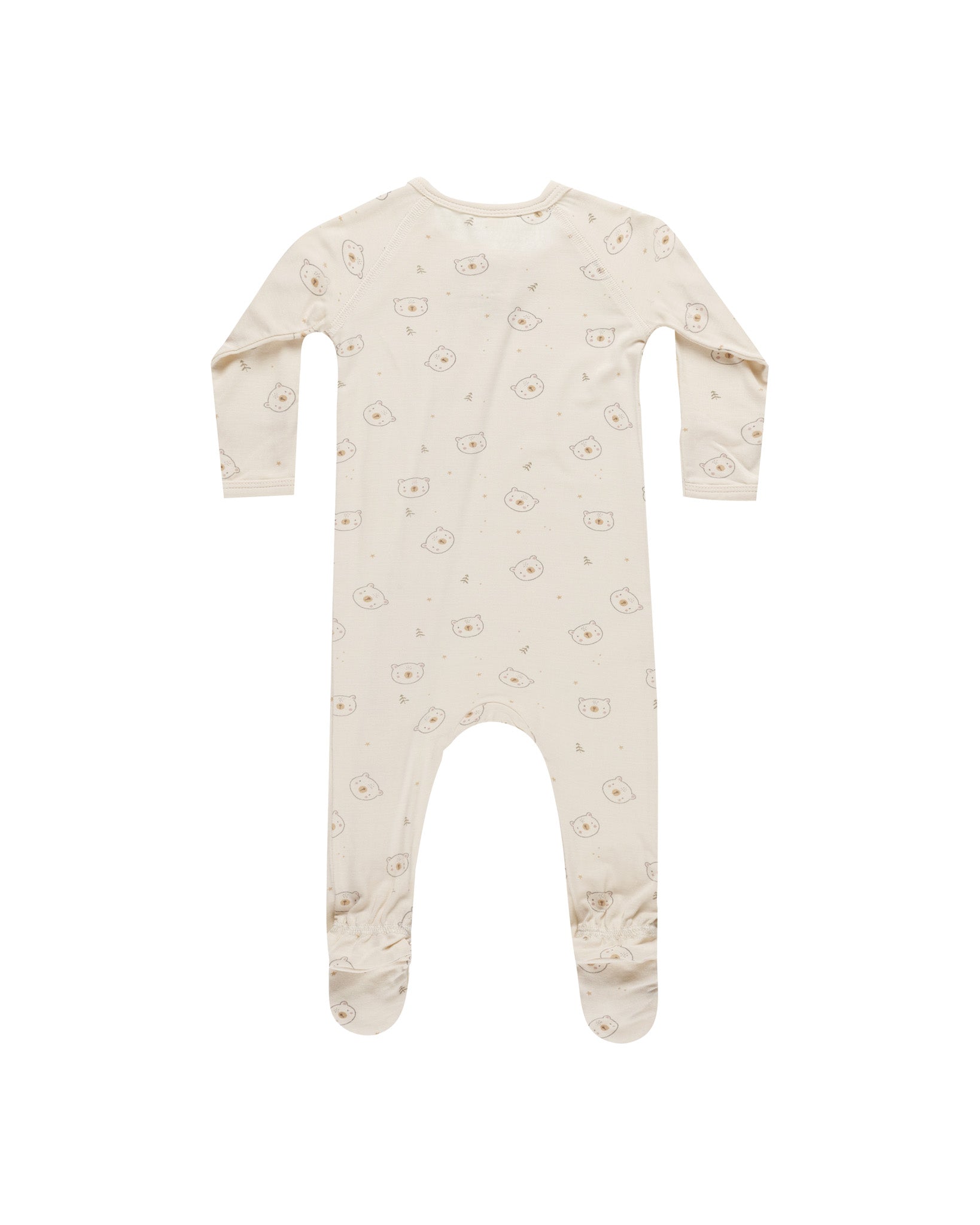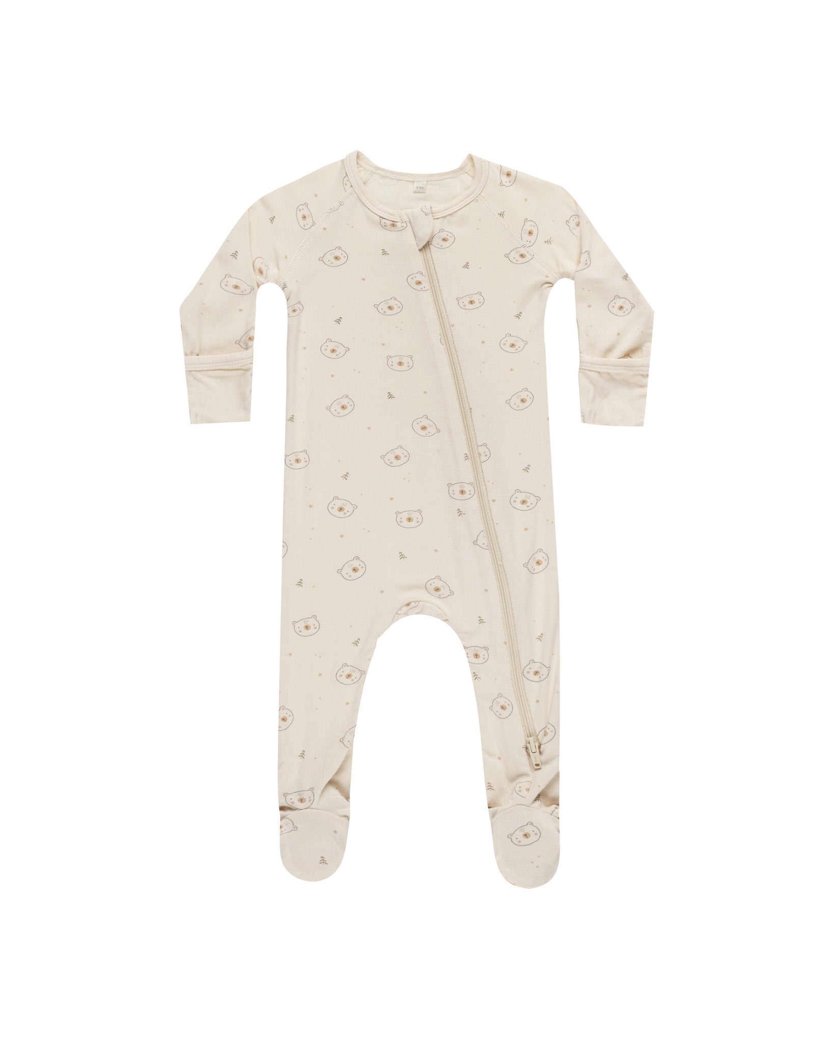 This cozy bamboo footie pajama is super soft and features a happy bear set on a cream background.