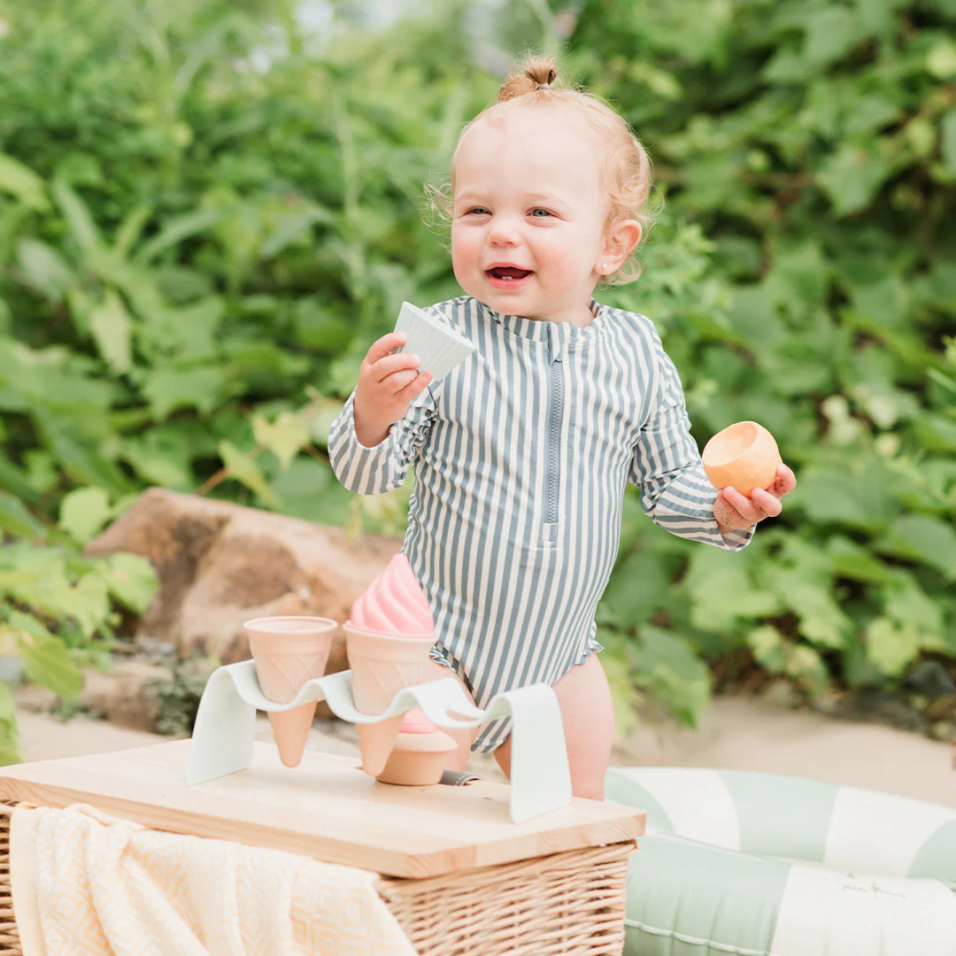 This classic striped bodysuit is a stylish and practical choice for little girls. It offers extra warmth and sun protection for swimming and water play.