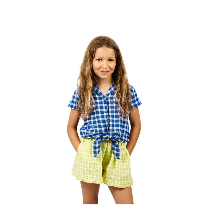 This Bow Plaid Blouse is a charming and stylish addition to any toddler’s wardrobe. Featuring a classic blue and white plaid pattern, this short-sleeved blouse is perfect for warm-weather outings. The lightweight, breathable fabric ensures all-day comfort, while the notched collar and button-down front add a touch of vintage-inspired elegance.