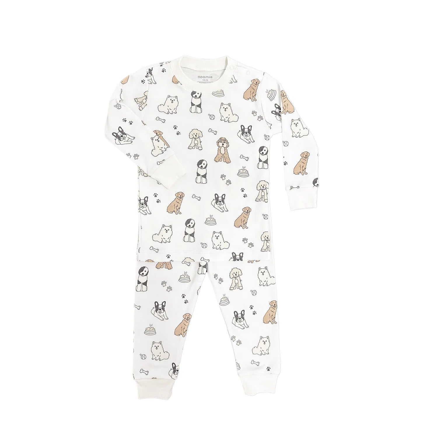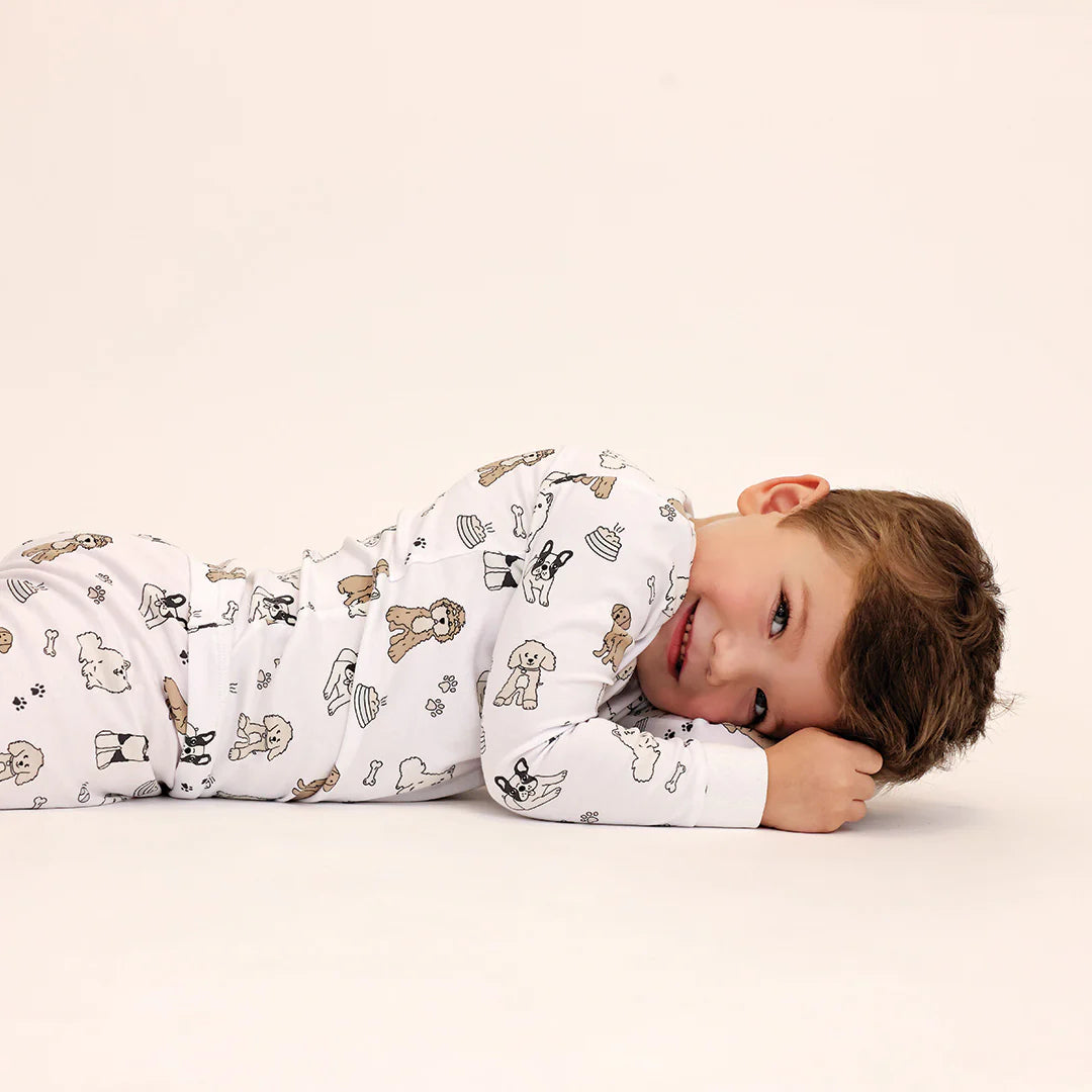 This long sleeve, two-piece pajama set features a charming pattern of different dogs -- from playful puppies to cute canines. It's sure to capture the hearts of all dog lovers! This Pima cotton pajama comes in a white, buttery soft fabric that is breathable and hypoallergenic.