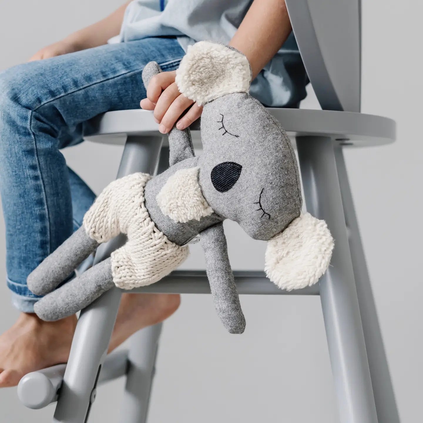 Fergus Koala is made with the softest wool blend fabric and wears hand-knit cream pants made from Australian merino wool.