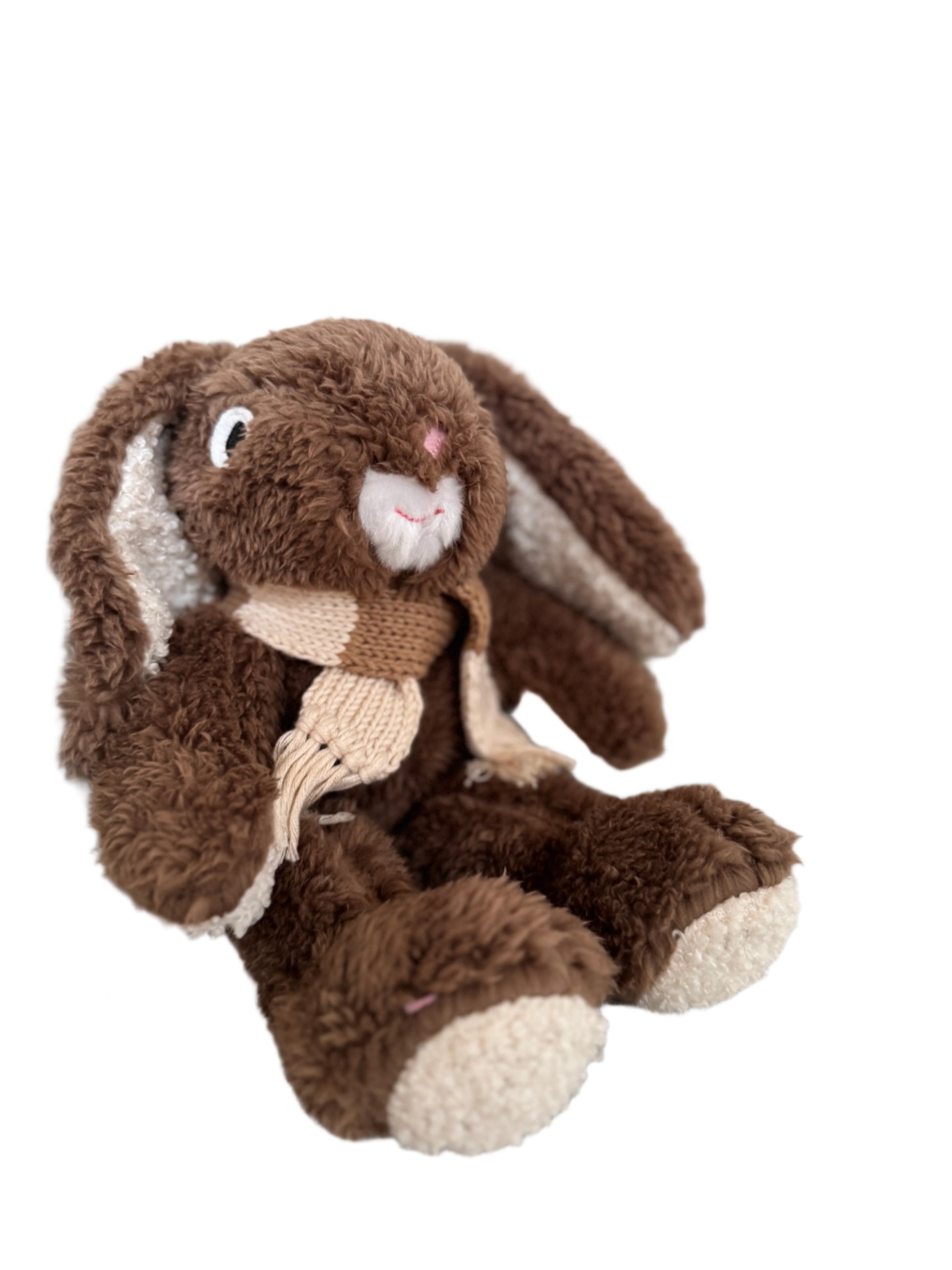Frankie Bunny is made with super soft chocolate brown plush fabric and wears a hand-knit, striped scarf made from Australian merino wool.