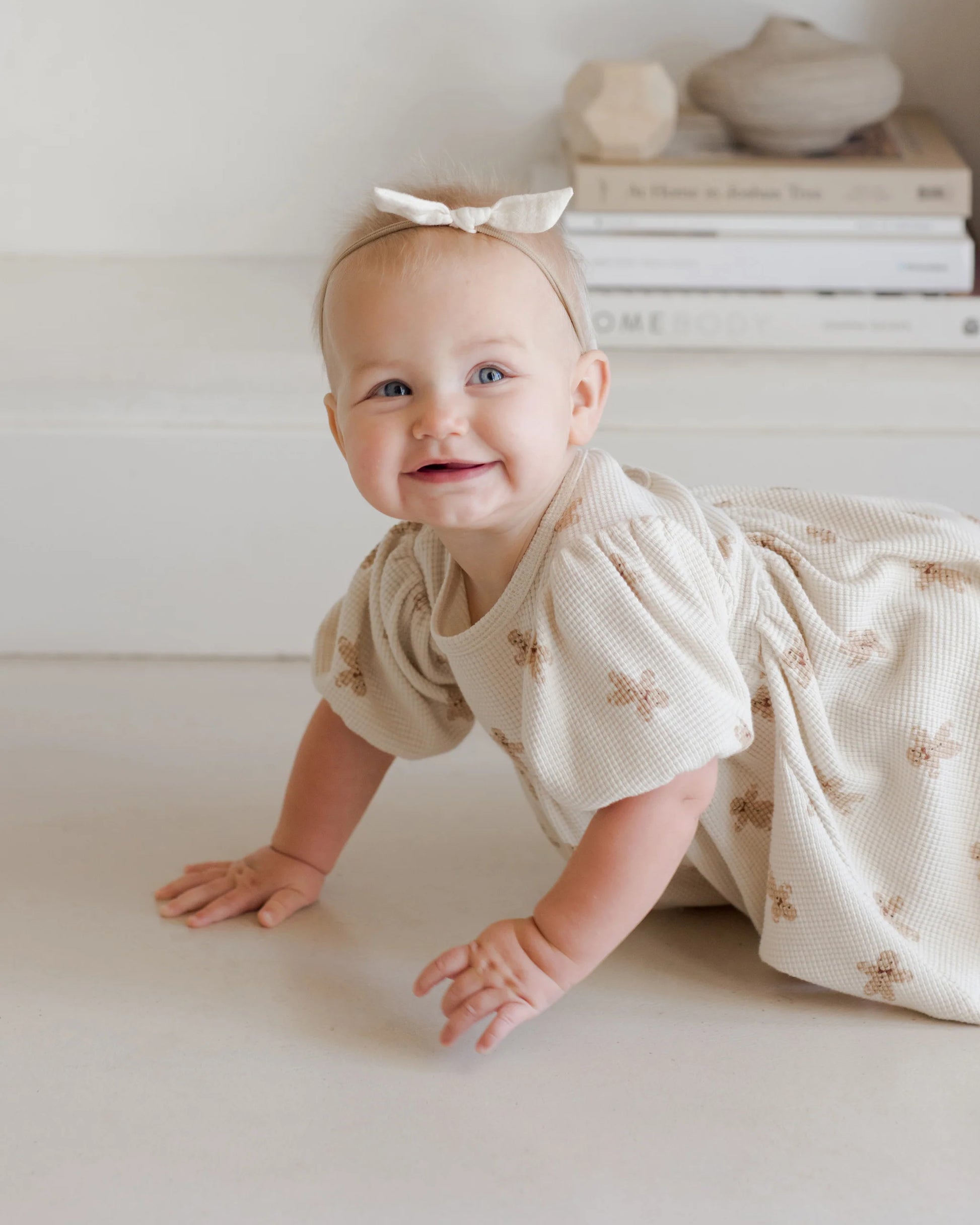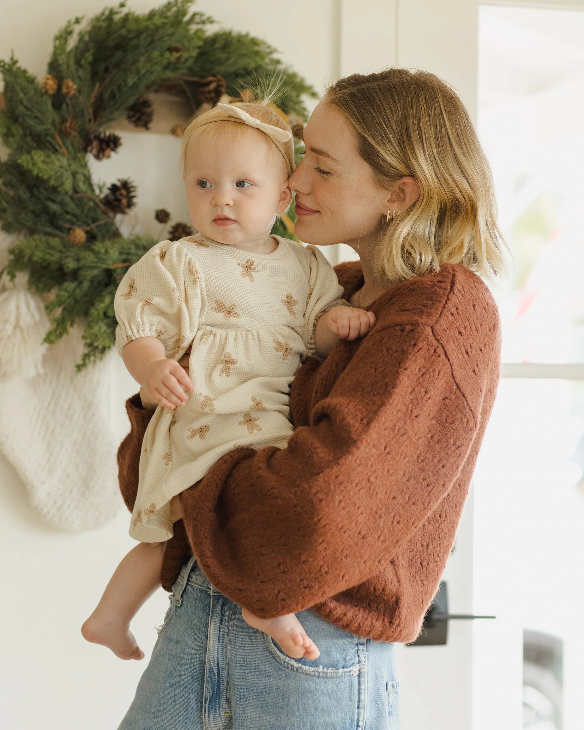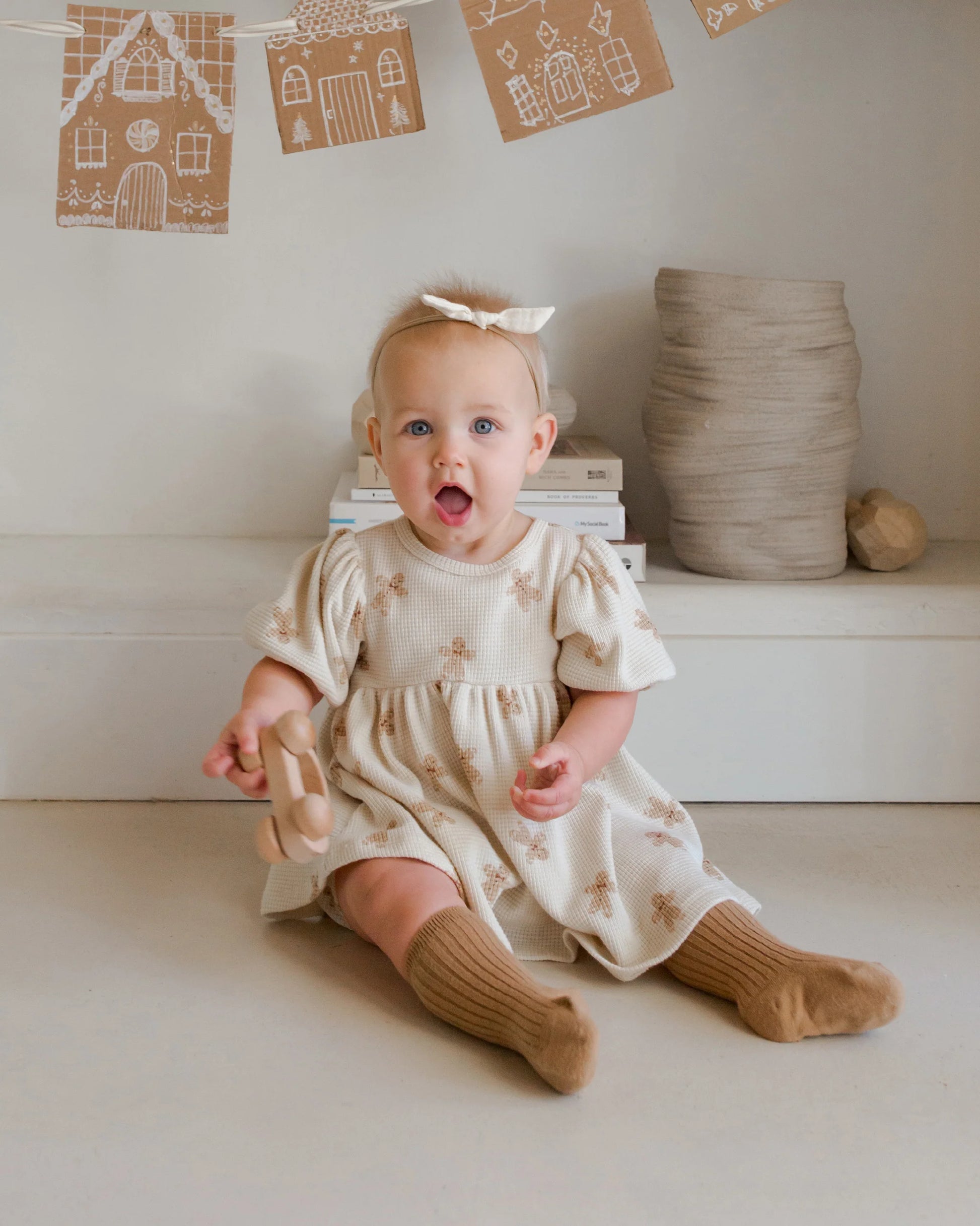 Get your little one holiday-ready with Quincy Mae's Waffle Babydoll Dress Set, featuring a charming gingerbread print! This cozy set includes a sweet empire waist dress with balloon sleeves, a coconut button keyhole at the back, and matching baby bloomers. Perfect for festive gatherings, this dress set combines seasonal charm with comfort, making it an adorable choice for holiday celebrations.