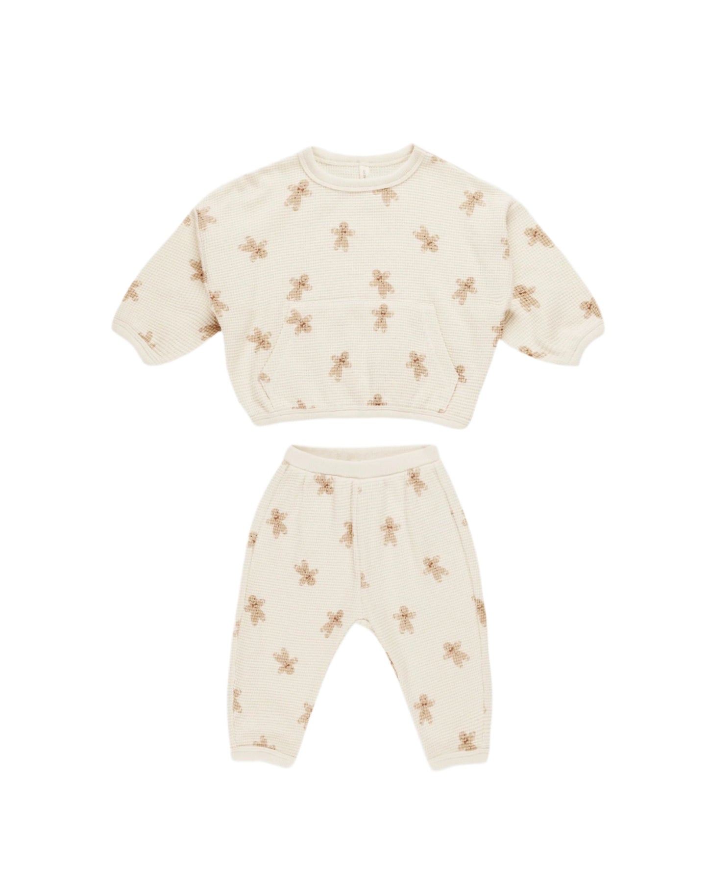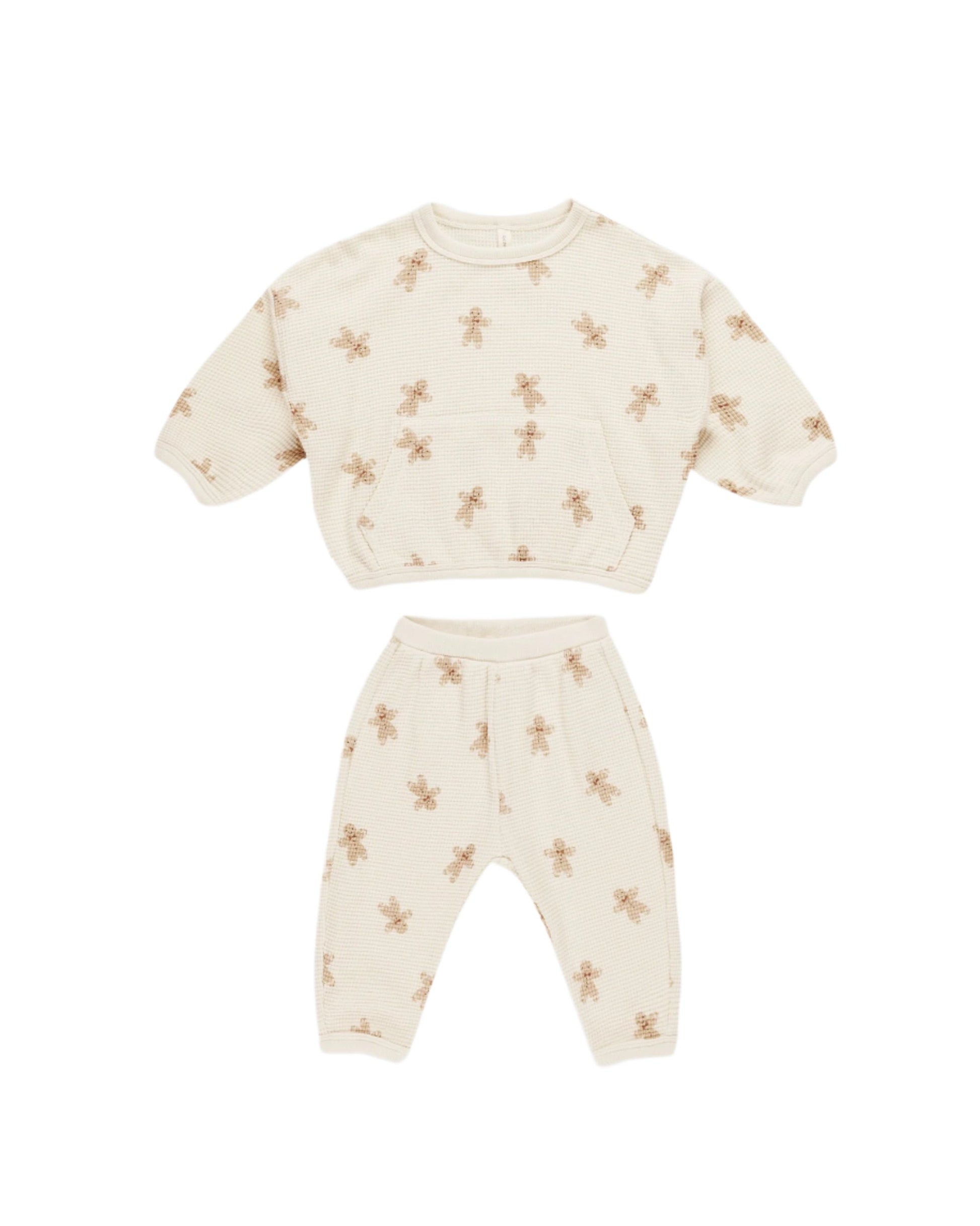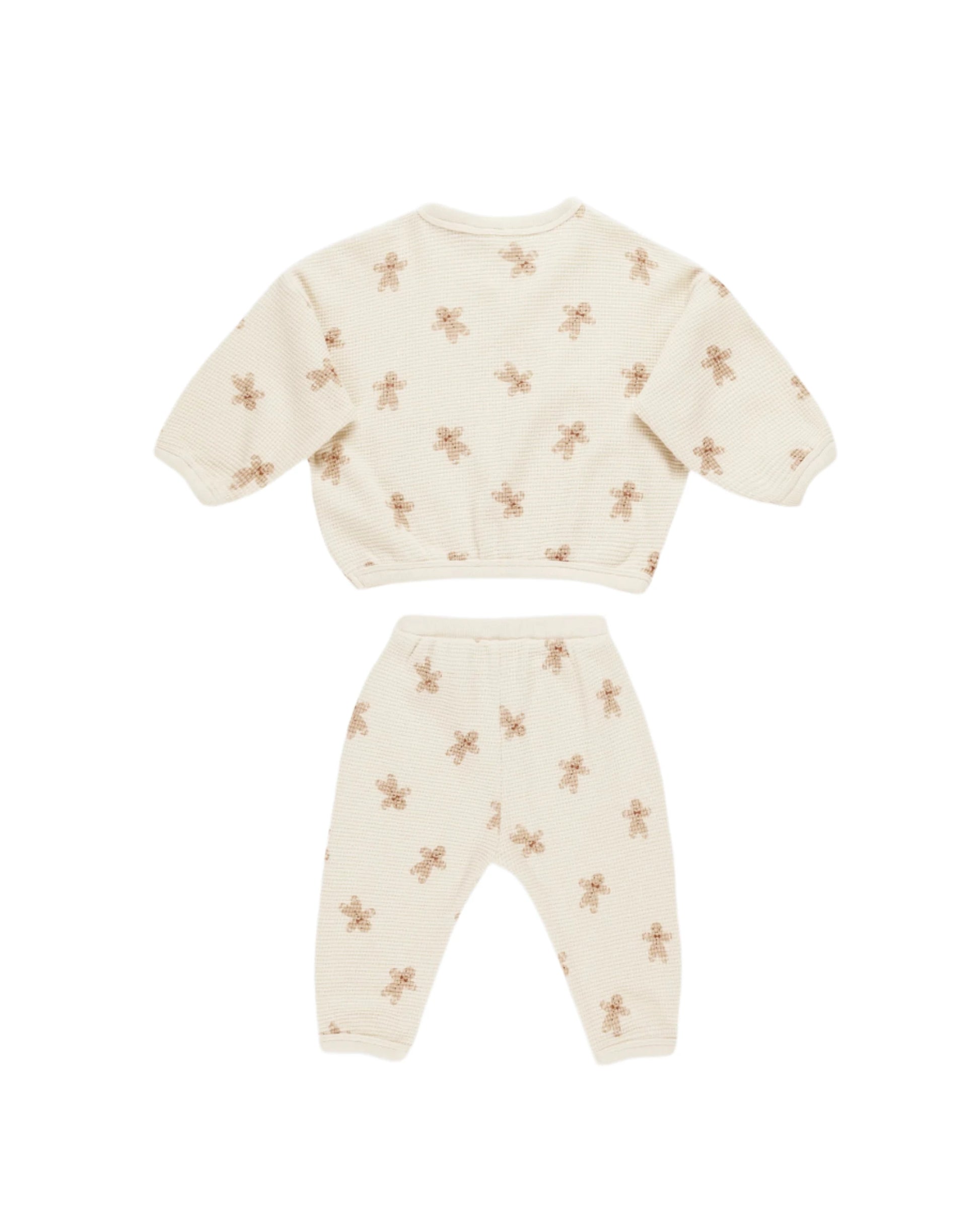 The long-sleeve top offers a relaxed fit with just the right amount of stretch, while the matching pants are designed with a snug yet comfy waistband to ensure all-day ease. Featuring a delightful gingerbread all-over print on a natural backdrop, this set adds a playful, seasonal charm to your child’s wardrobe.