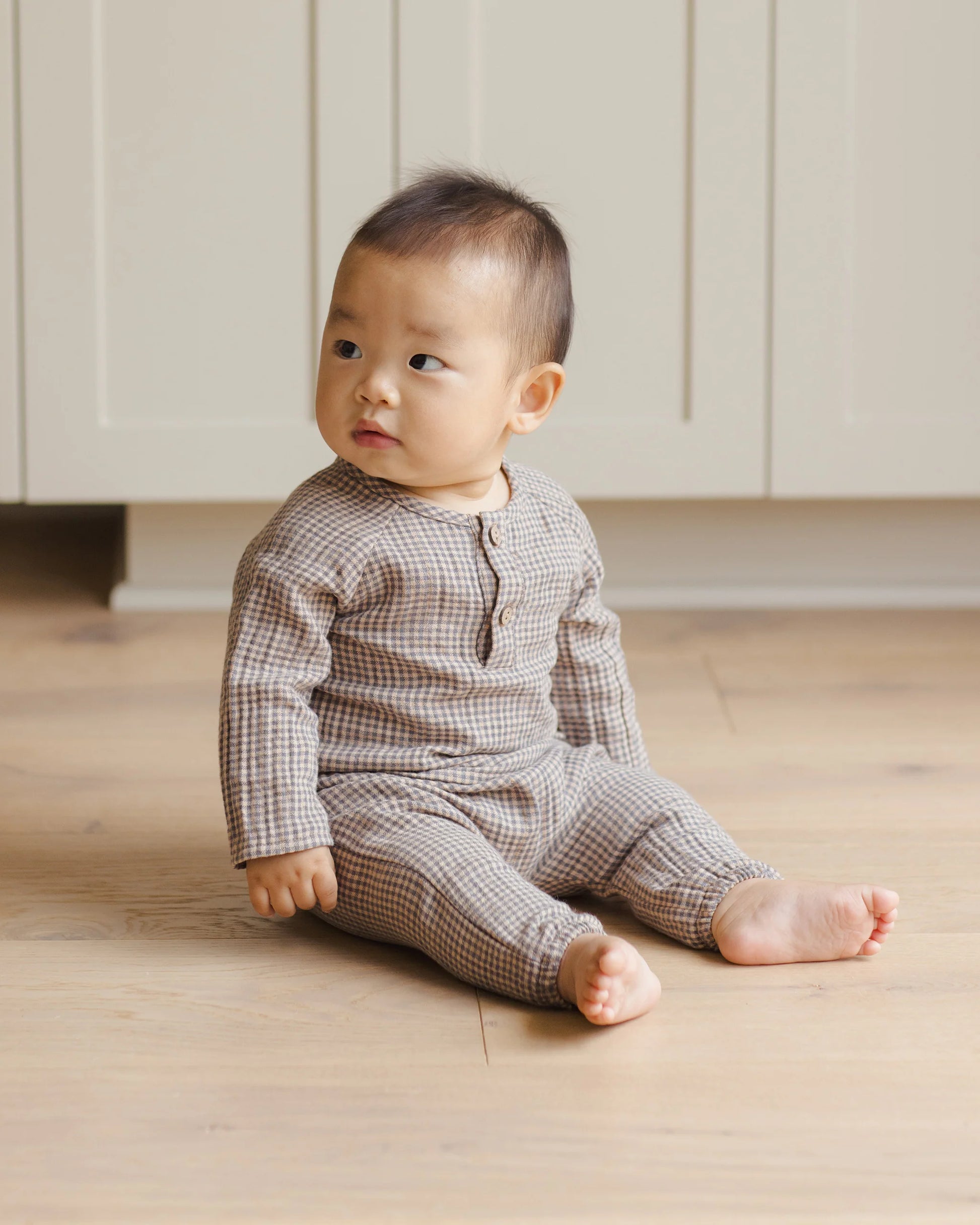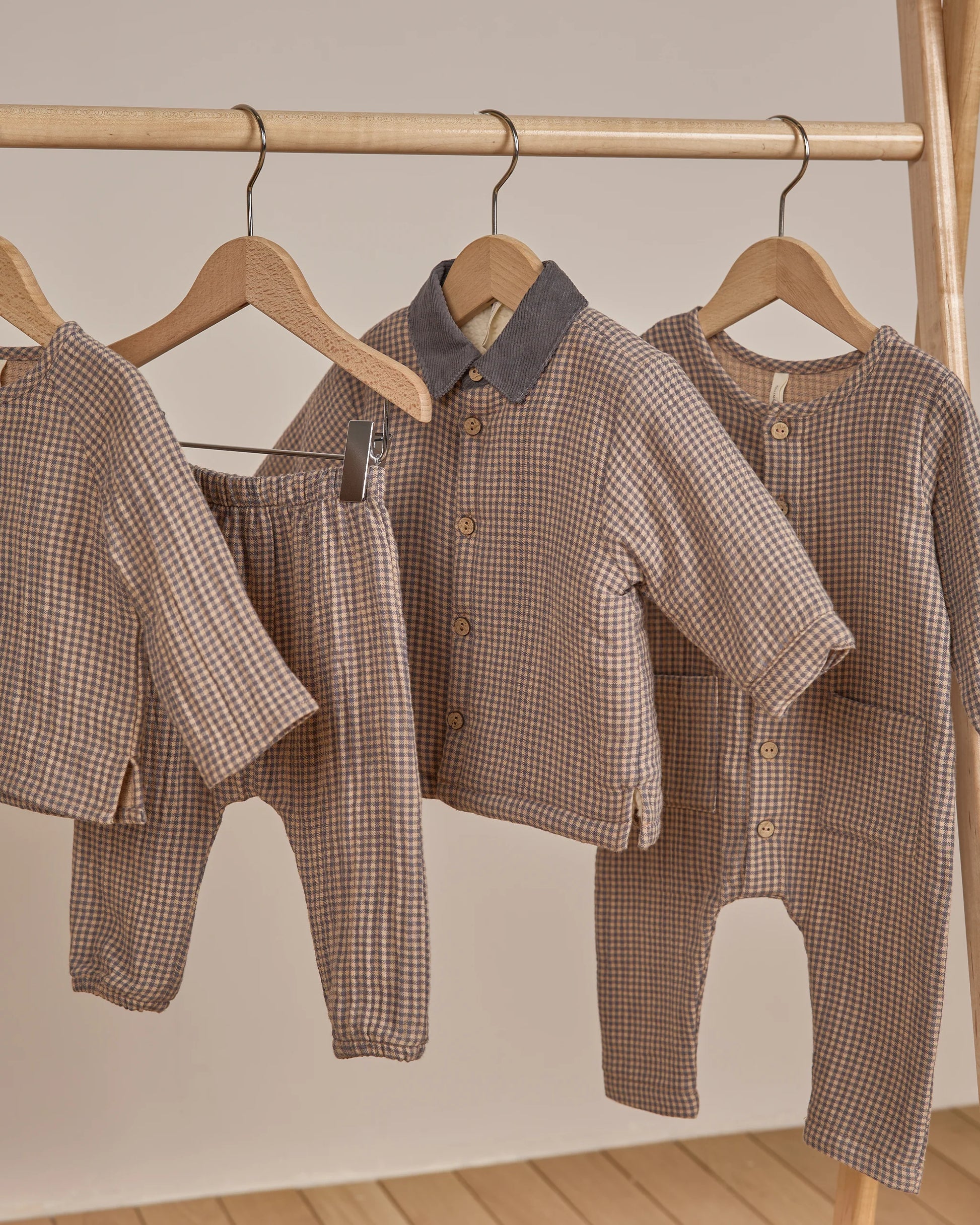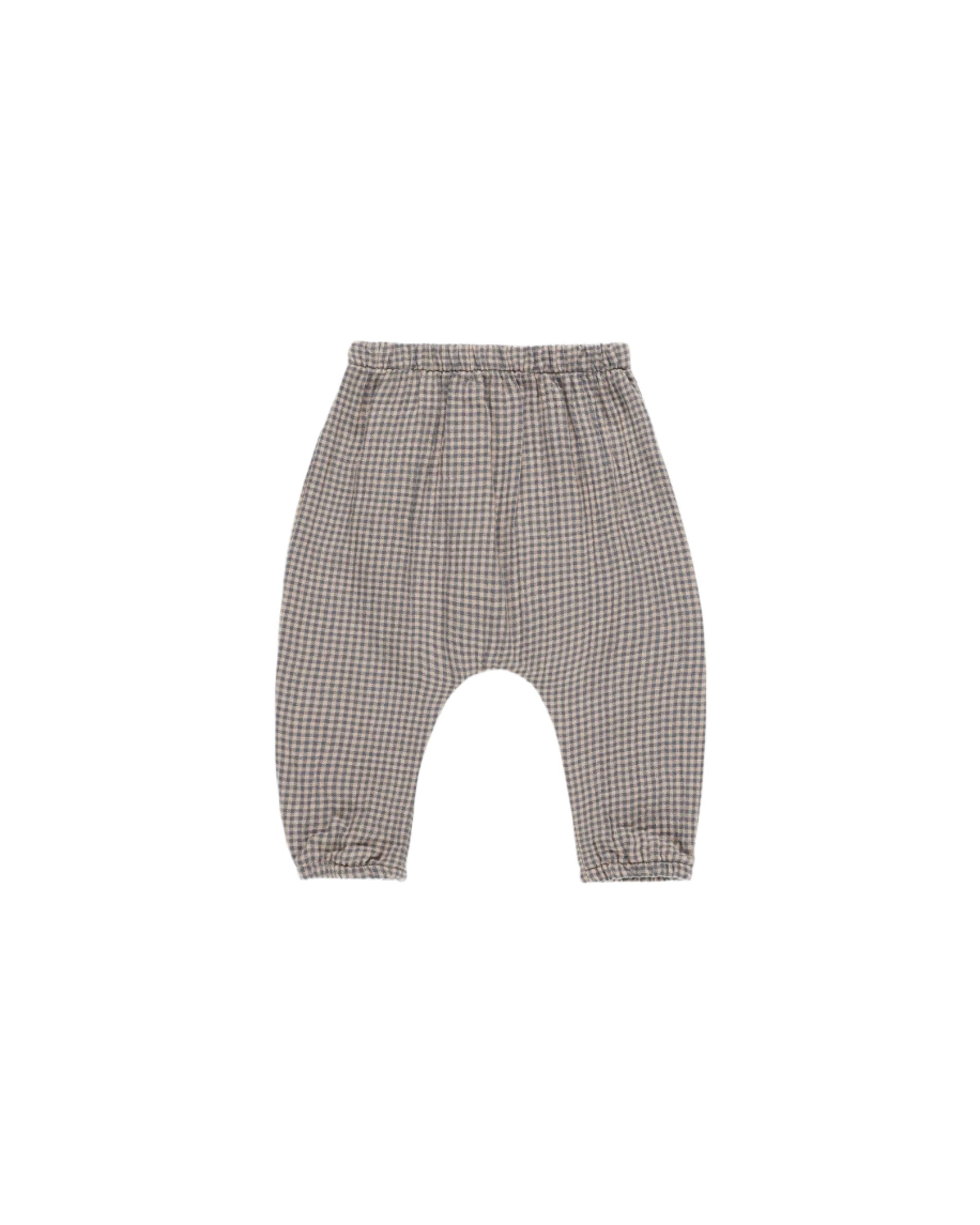 These super soft woven pants featuring an elastic waistband and leg openings, and a dropped crotch to ensure a relaxed, slouchy fit. They feature an 'indigo gingham' all over pattern.