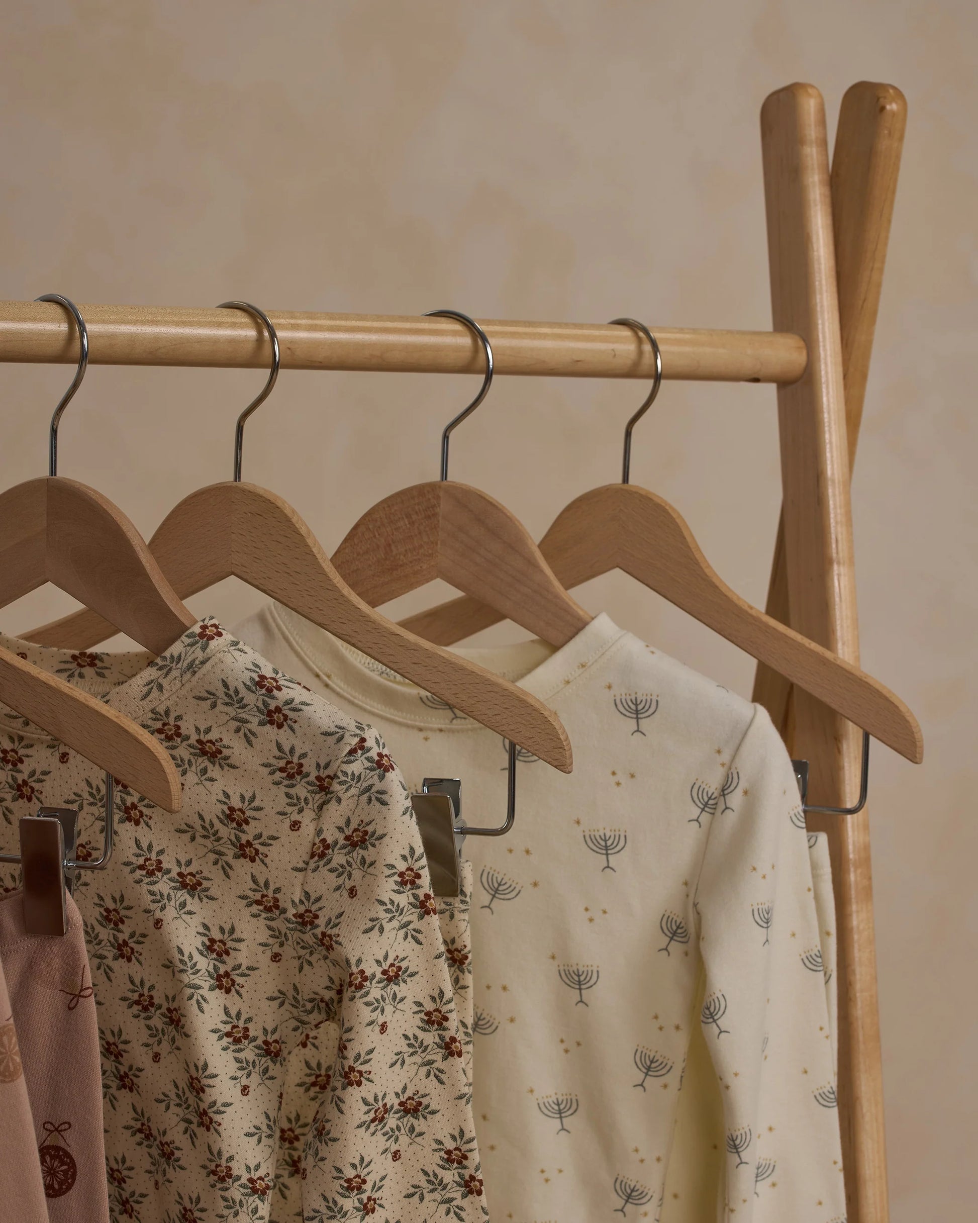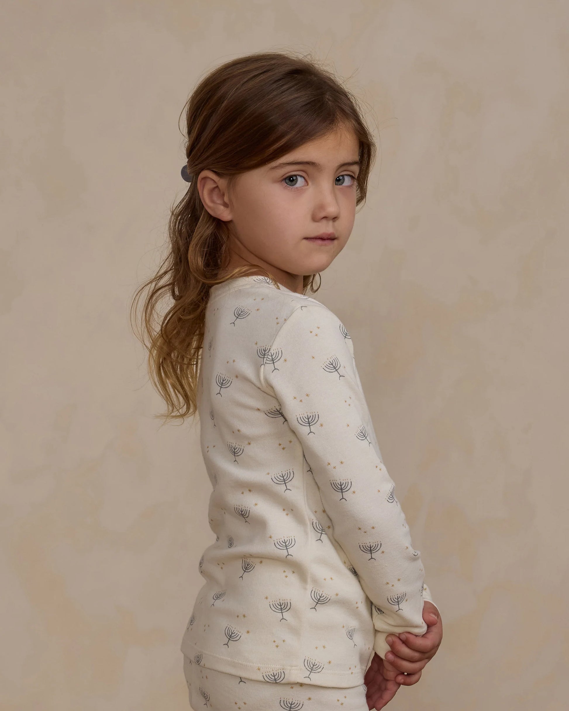Celebrate the season with this cozy pajama set, featuring a charming Hanukkah pattern adorned with menorahs. Crafted for comfort, the set includes the softest long-sleeve top and matching leggings with banded cuffs, ensuring a snug fit for your little one. Perfect for festive nights or lounging, these pajamas combine style and warmth, making them a holiday favorite for kids.