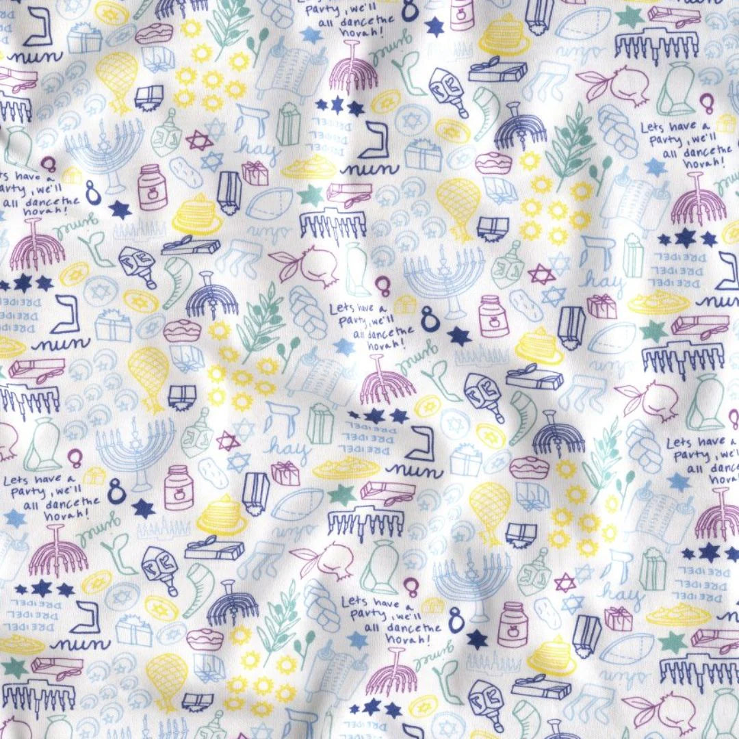 Make bedtime a celebration with these ultra-soft, two-piece Hanukkah print pajamas! This cozy set includes a festive henley top with three buttons and matching pants, both featuring all your favorite Hanukkah traditions—dreidels, gelt, latkes, applesauce, and more. Perfect for sweet dreams of dancing the horah and enjoying the magic of the Festival of Lights, these jammies will have your little one excited for bedtime all holiday season and beyond!