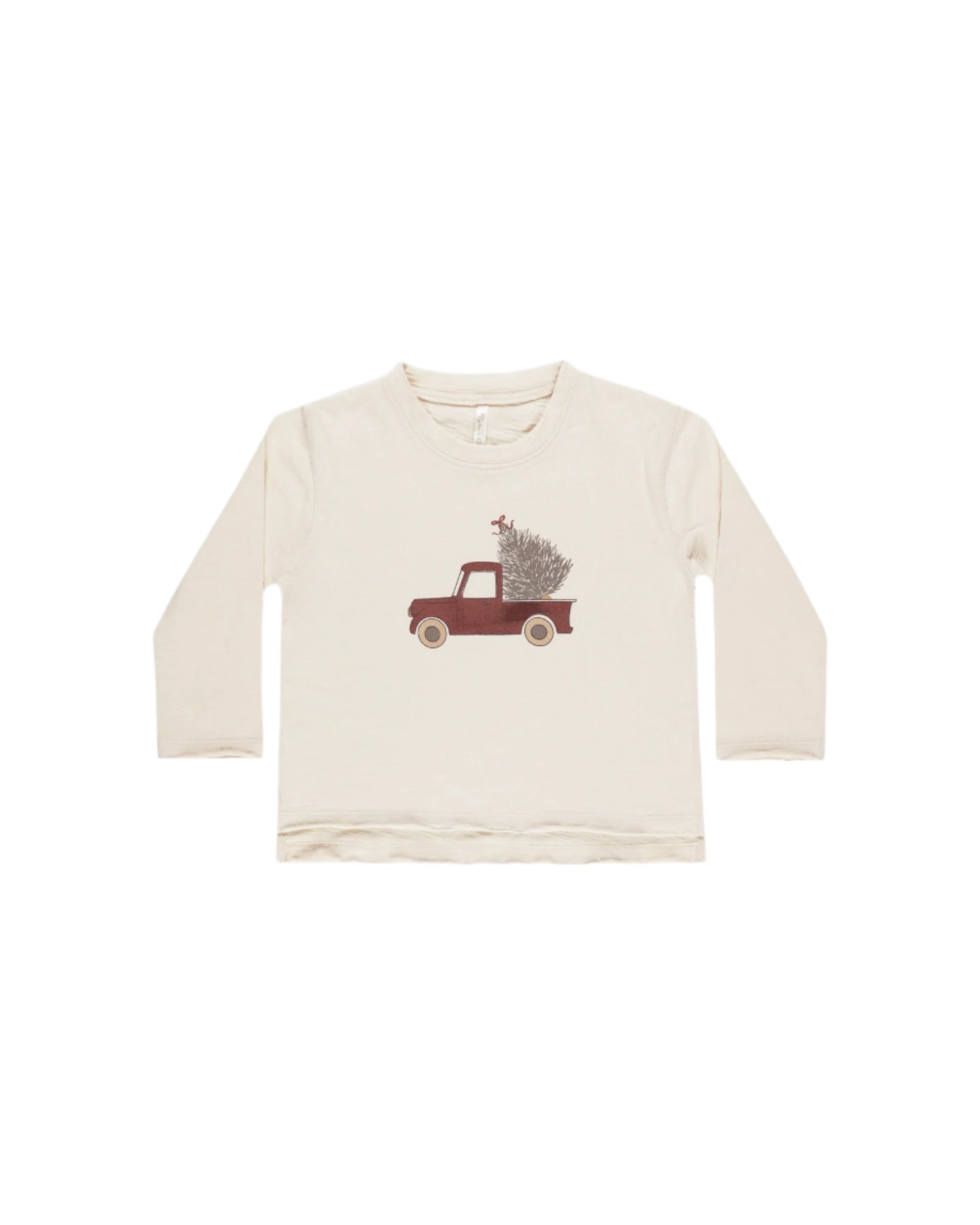 Get your little one holiday-ready with this adorable natural long sleeve tee, featuring a festive pickup truck design with a pine tree in the bed. Crafted from soft cotton slub fabric, this comfortable, boxy-fit tee offers a cozy, stylish look with a raw finished hemline for an added touch of charm. Designed for baby sizes (0-3M through 18-24M) with practical shoulder snaps, making dressing a breeze. Perfect for creating cozy holiday vibes and celebrating the season in style!
