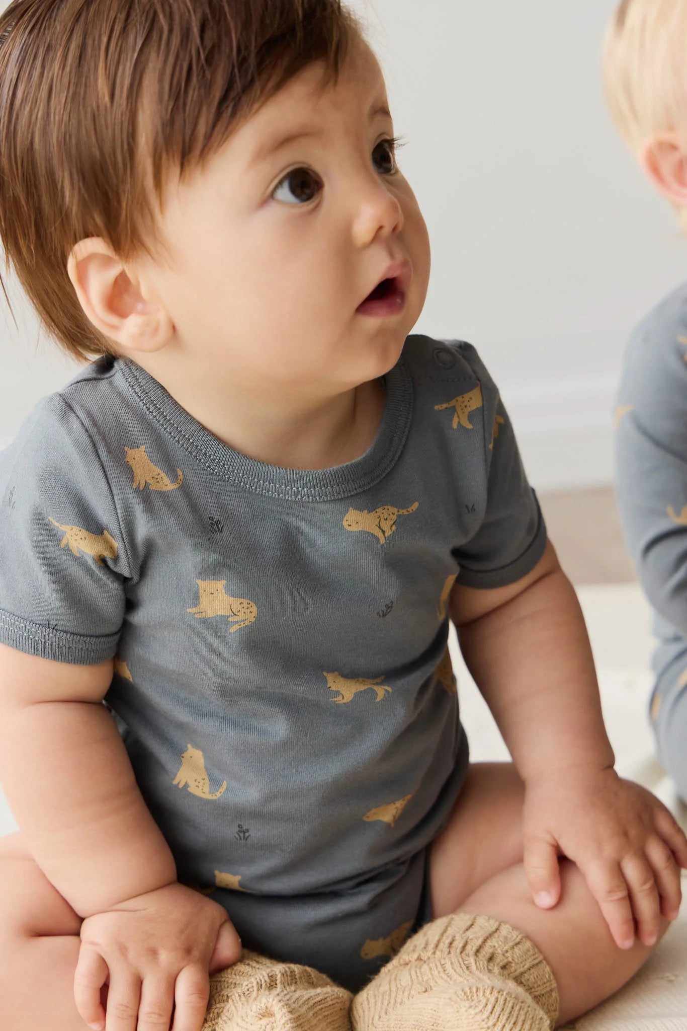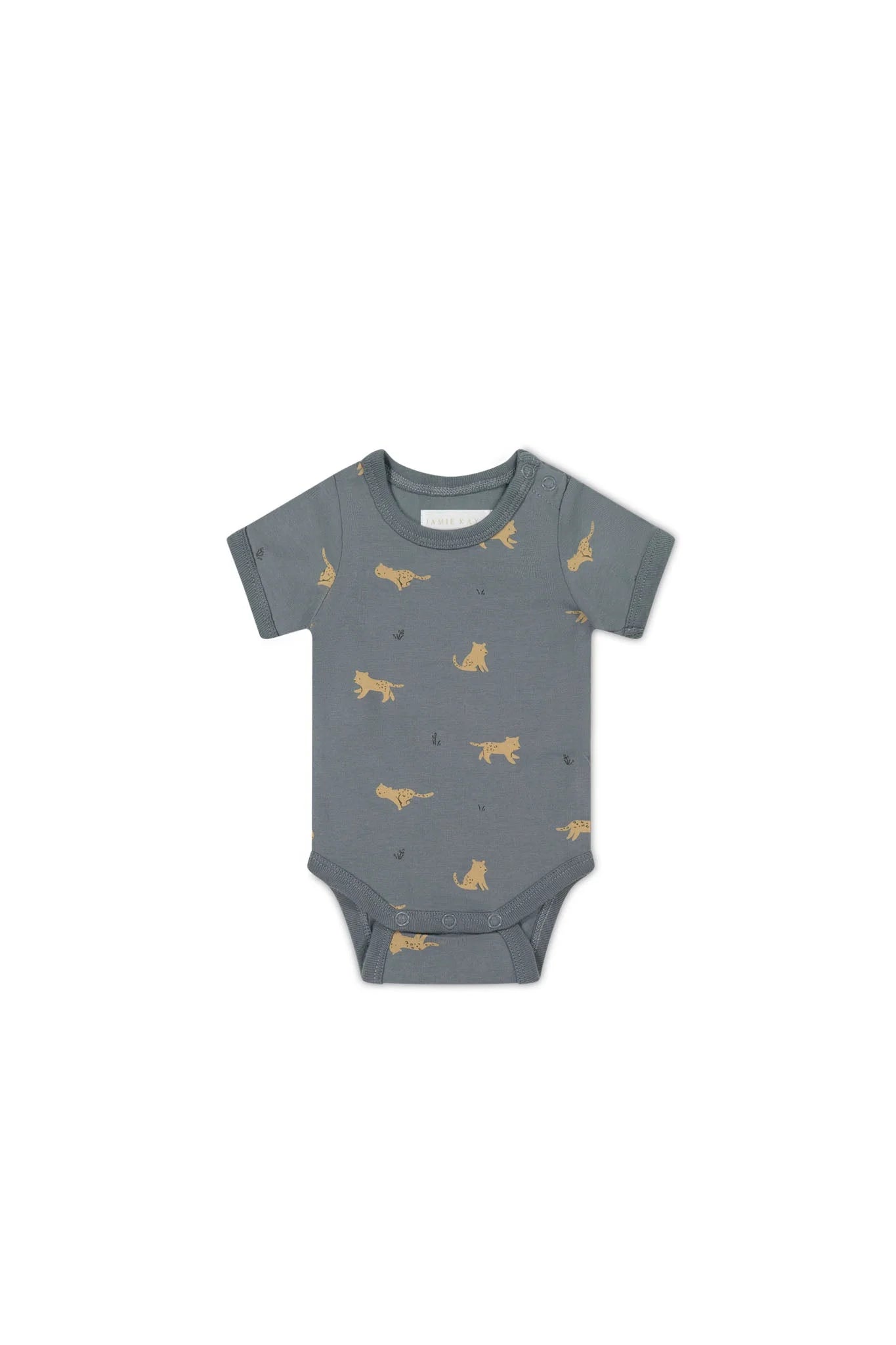 This adorable organic body suit comes in a rich slate grey color with playful leopards.