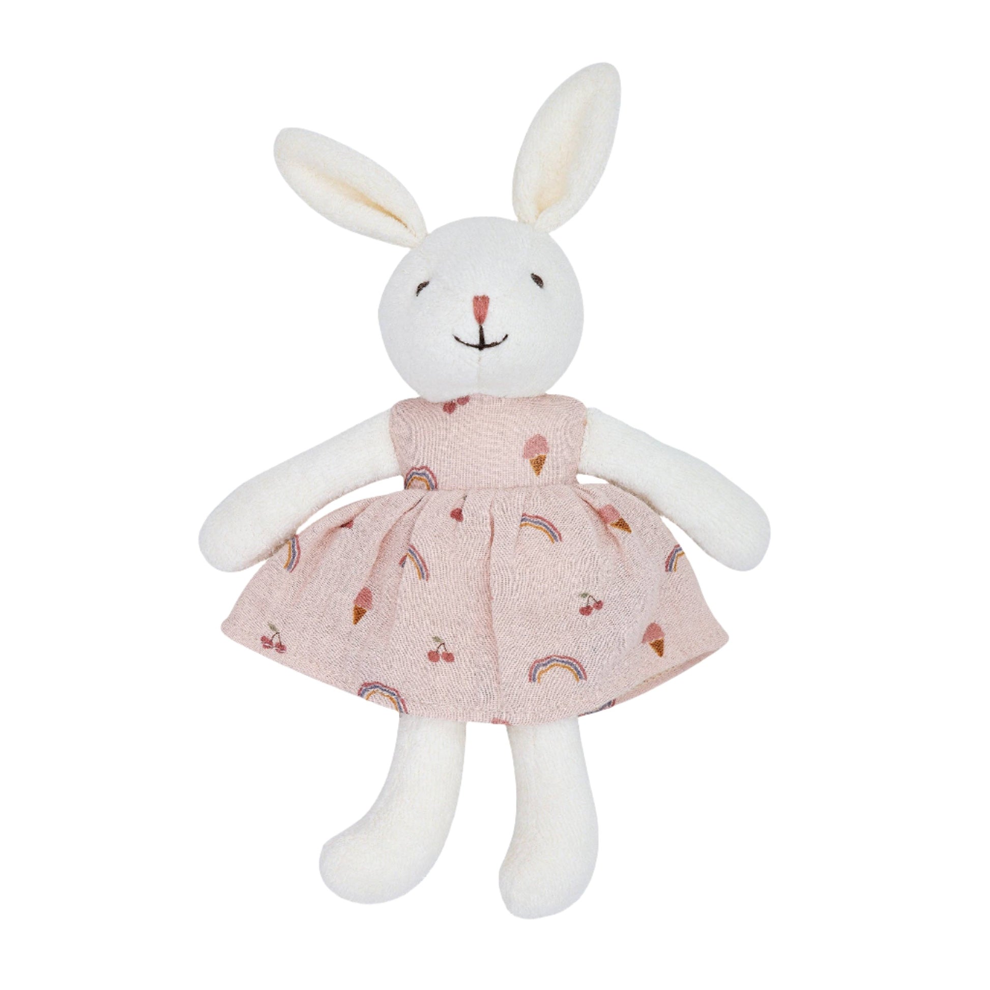 This sweet plush bunny is an adorable and cuddly companion that brings a touch of whimsy and joy to every hug. She wears a pale pink dress with a rainbow and ice cream print that has coordinating rompers for your baby or toddler.
