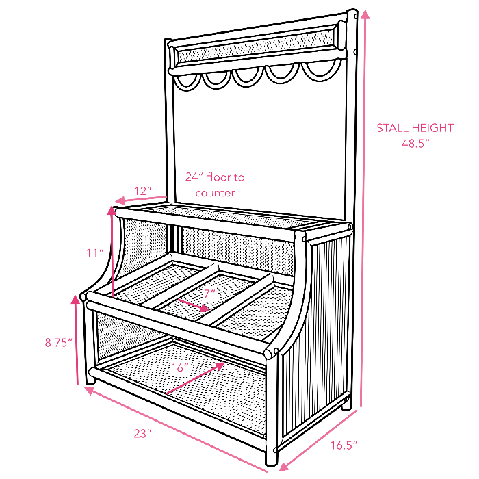 Measures 48.5" x 23" x 16.5"; Counter 24", Chalkboard 17.5" x 12.5"