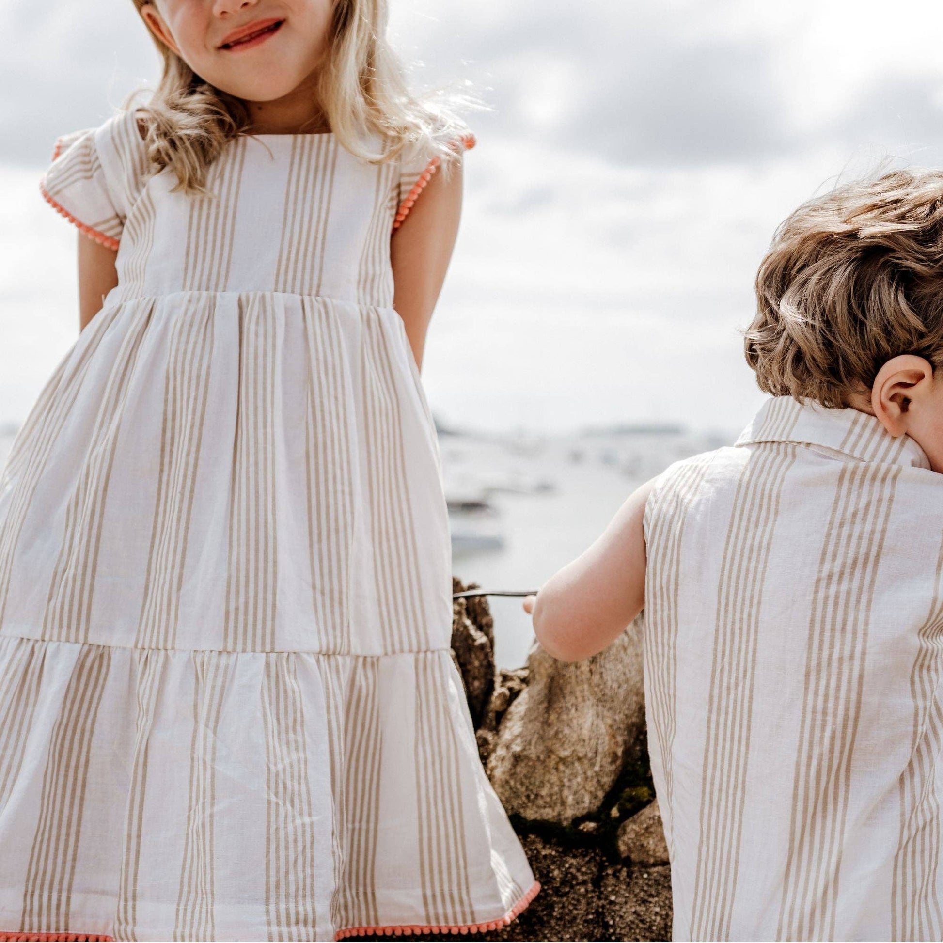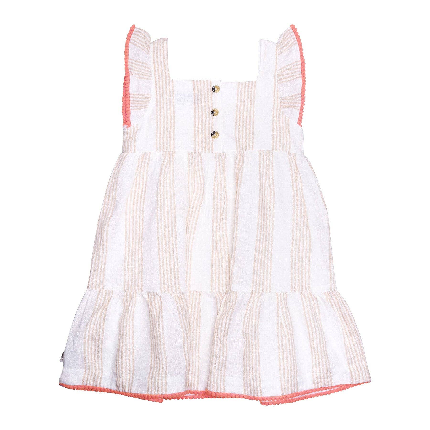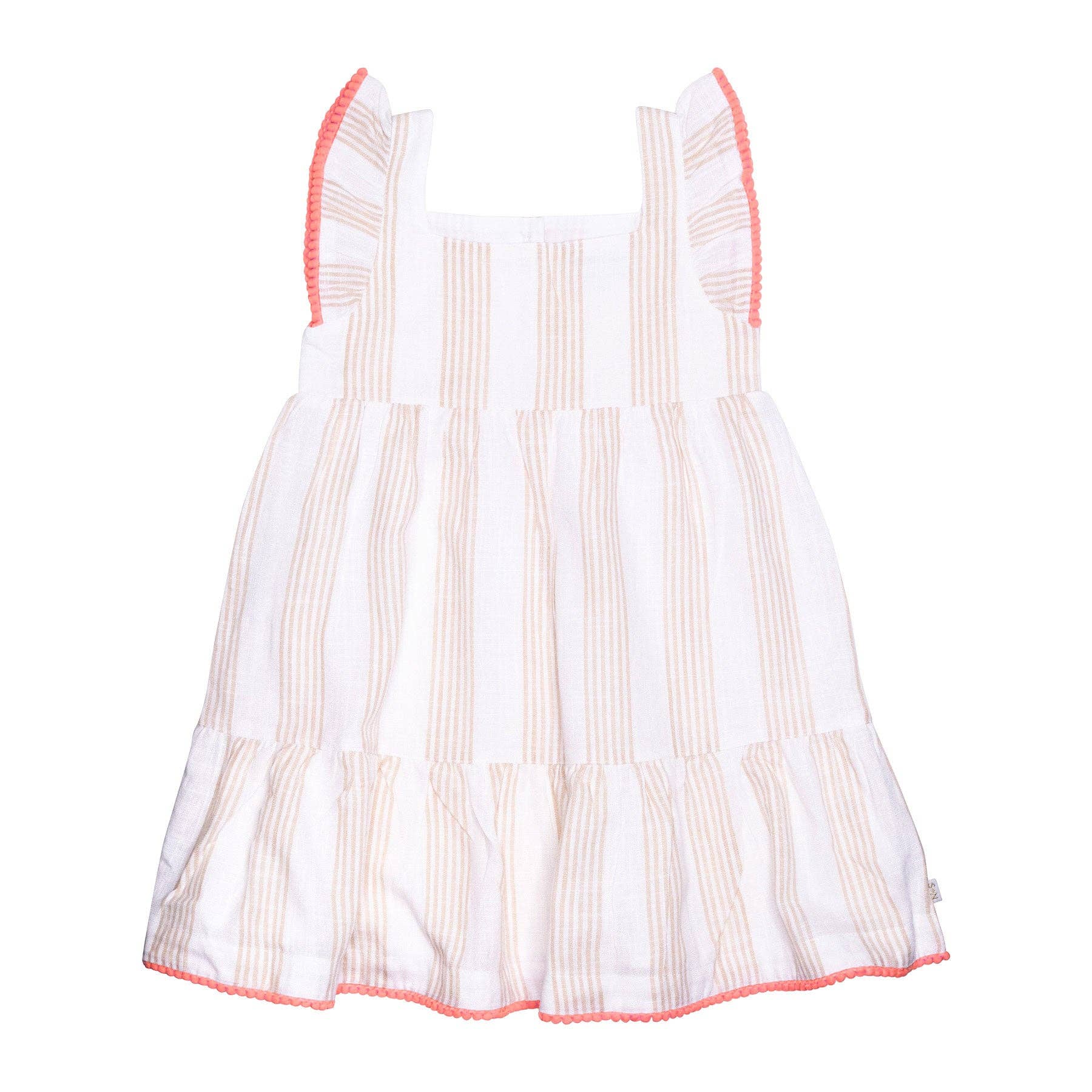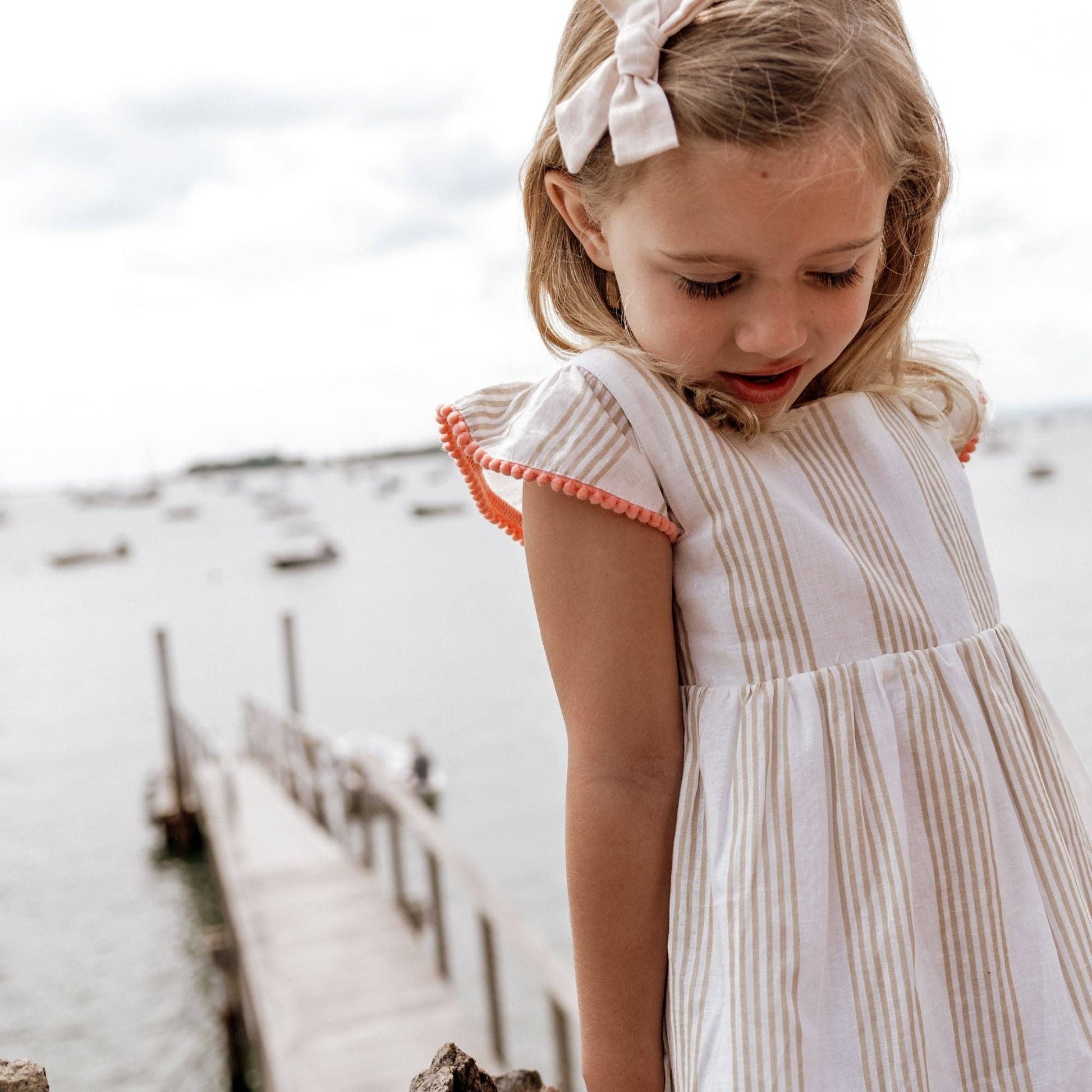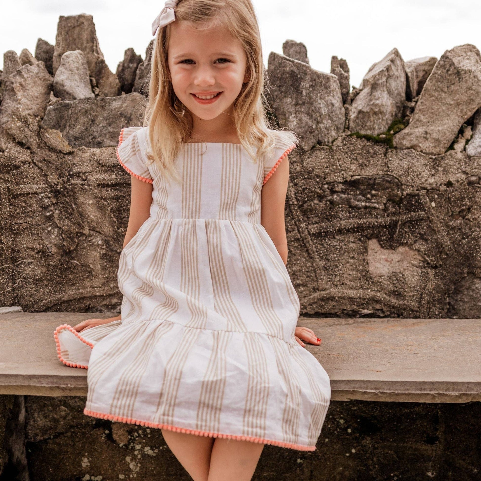 This beautiful linen dress features a natural linen stripe with a fun, pink pom-pom detail at the shoulder and hem. It comes fully lined, and is perfect for resort, beach, and play.