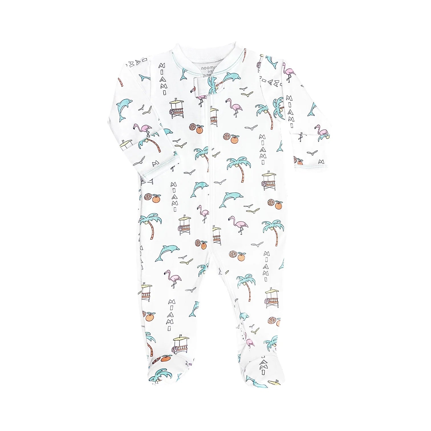 This adorable two-way zipper footie celebrates all things Miami -- the beach, flamingos, juicy oranges, and of course, palm trees! Made with 100% Pima cotton, it features a white, buttery soft fabric that is breathable and hypoallergenic.