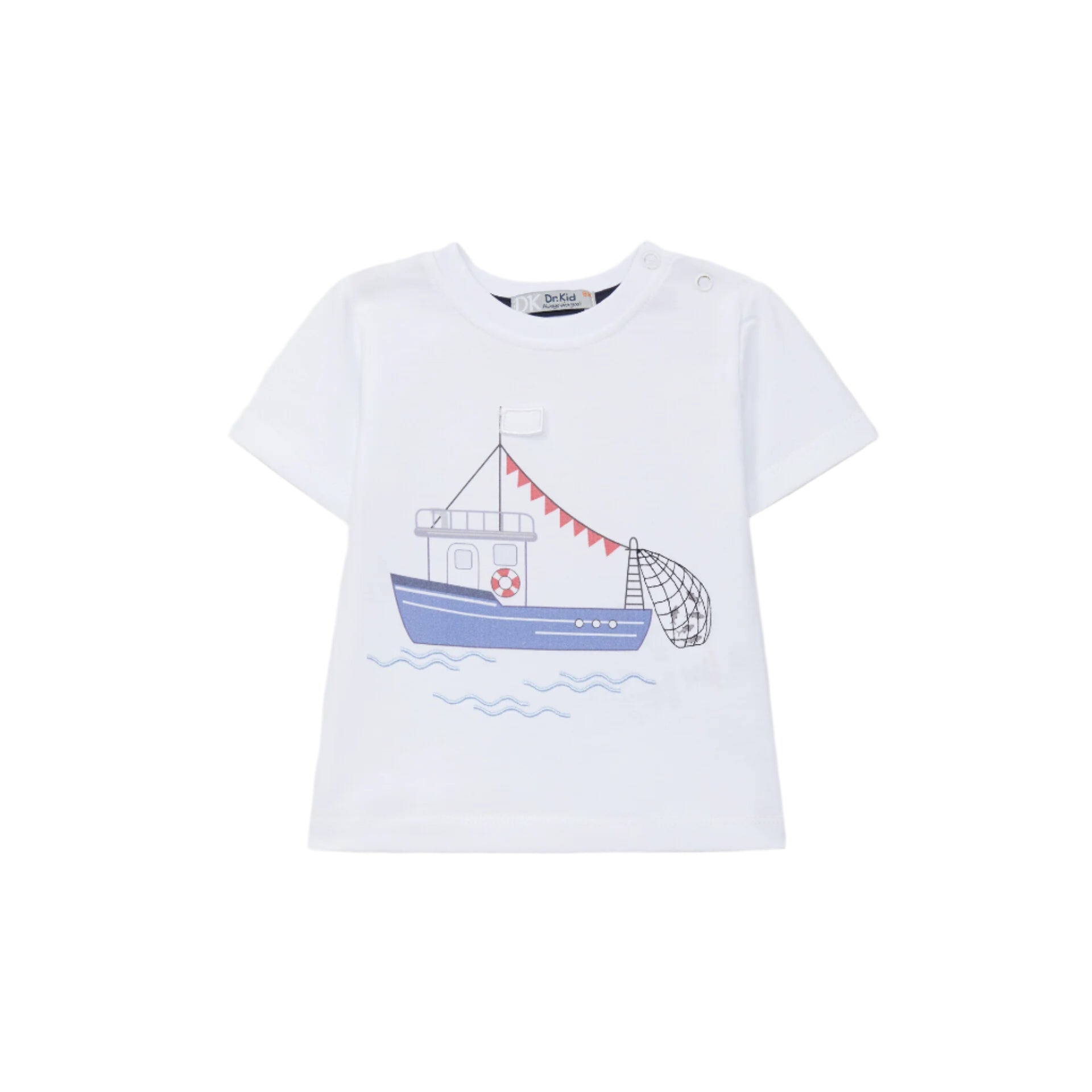 Introducing the Nautical Adventure Baby Tee, a charming addition to your little one's wardrobe. This baby boy's T-shirt features a delightful boat illustration on the front, capturing the essence of seaside adventures. Crafted from 100% soft, breathable cotton, it ensures comfort throughout the day. Available in classic white, this tee comes in sizes ranging from 12M-4T, accommodating your child's growth stages.