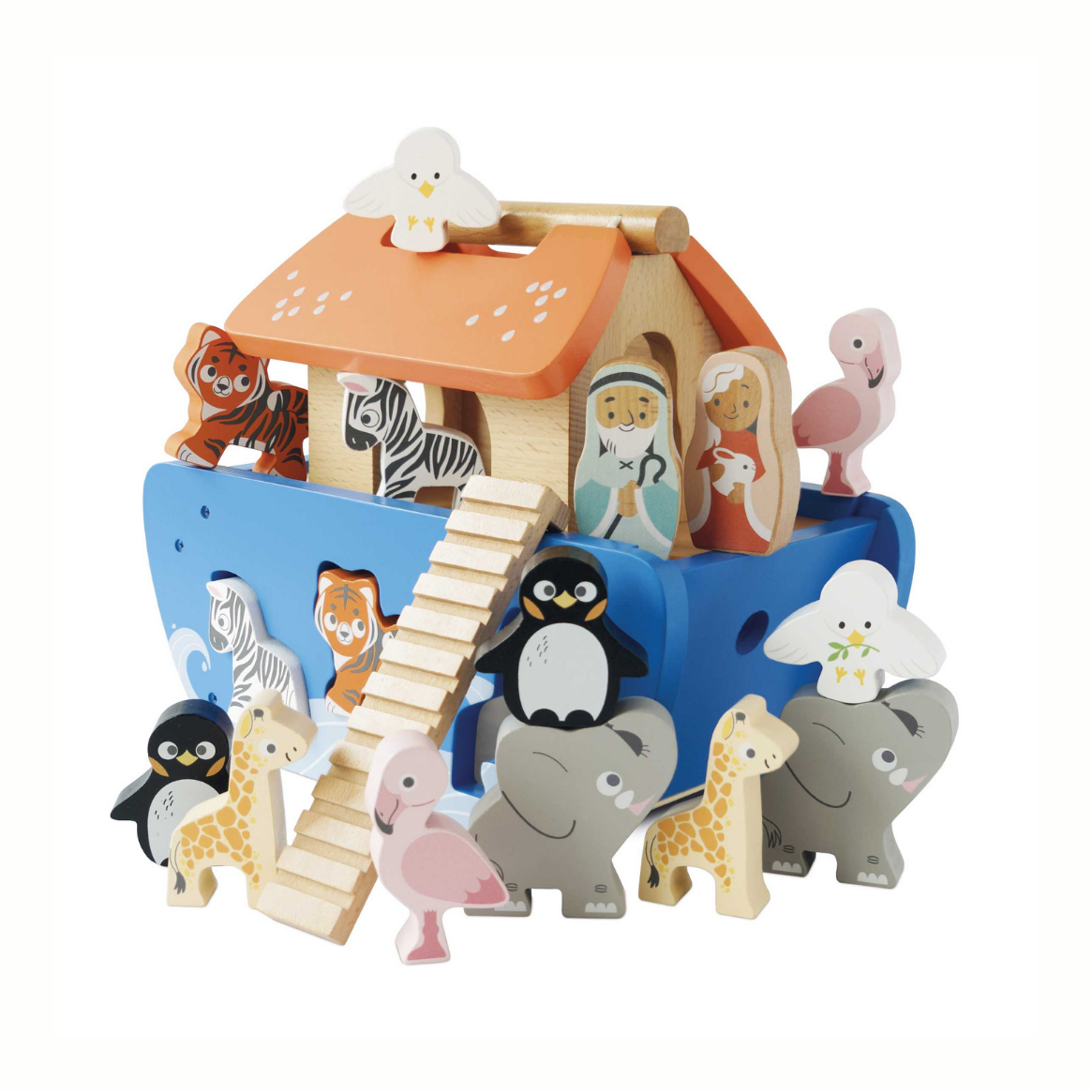 A wonderful toy to inspire and educate through play. This brightly painted ark has a handy carry handle and a ladder for the animals to board and disembark. This wooden toy helps toddlers develop their sensory, motor, and coordination skills by slotting the shapes into the corresponding holes.