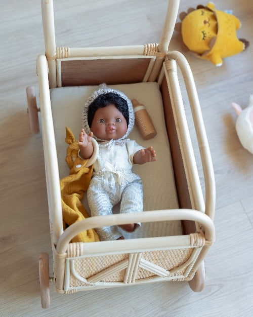 The Ollie Push Car is made from safe, child and planet-friendly materials, crafted from renewable and sustainable rattan with light-mahogany wheels. It arrives fully assembled, and comes complete with a soft foam mattress with a natural linen cover.