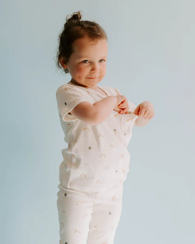 The softest, organic tee you will find in the most adorable playground print (which pairs perfectly with the playground leggings!). It has a velvety soft feel you and your child will love. There is a magnetic opening at the neck in sizes through 12-18 months for easy changing.