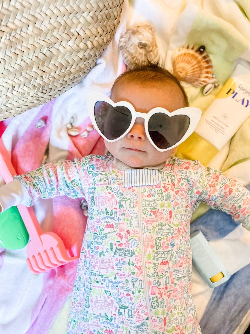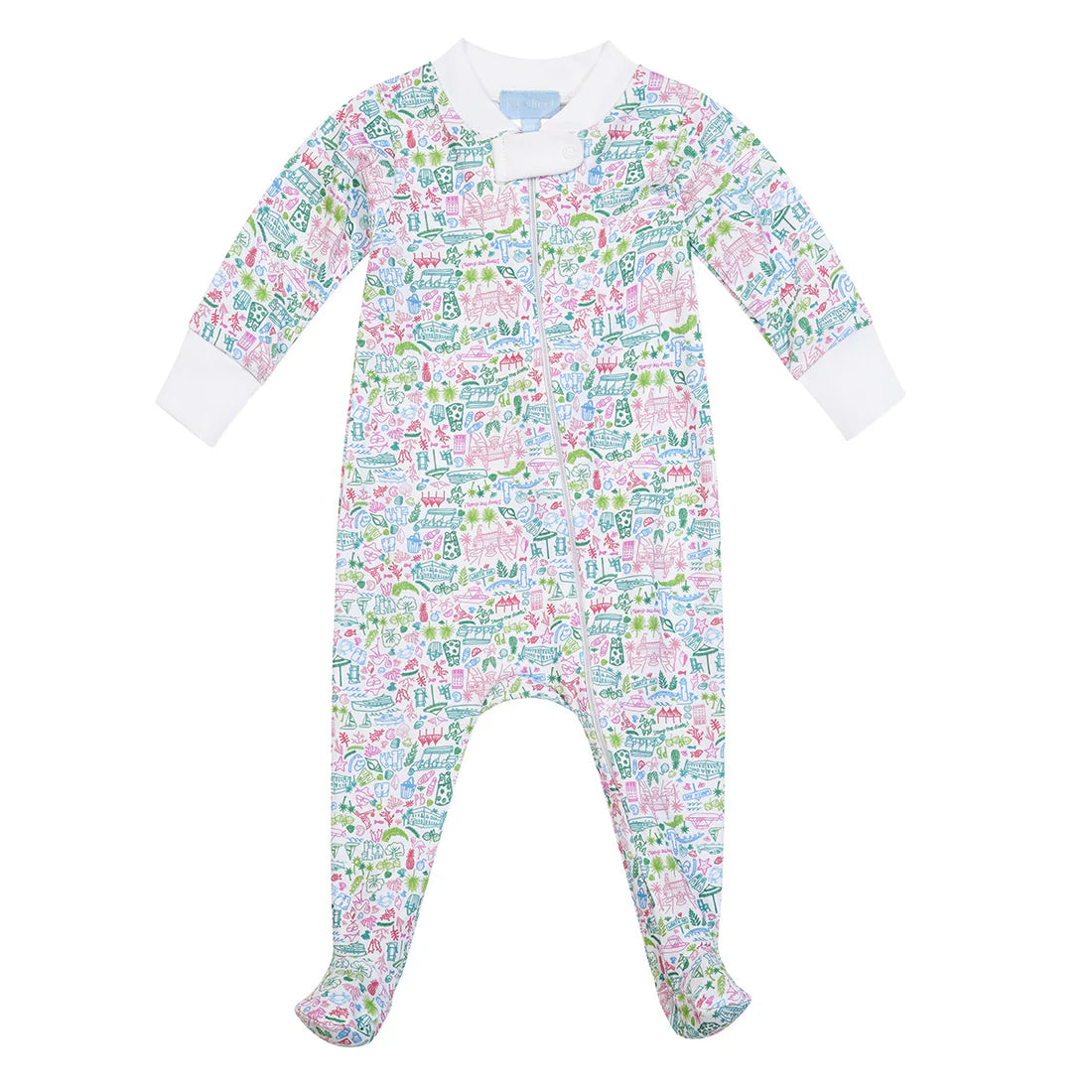 You will need your sun hat and shades as you explore our Palm Beach, Florida printed baby zip onesie. The fun pattern is hand drawn by Joy Street founder, Eliza. From polo to palm trees, have fun exploring all of the iconic Palm Beach renderings in this quintessential South Florida print!