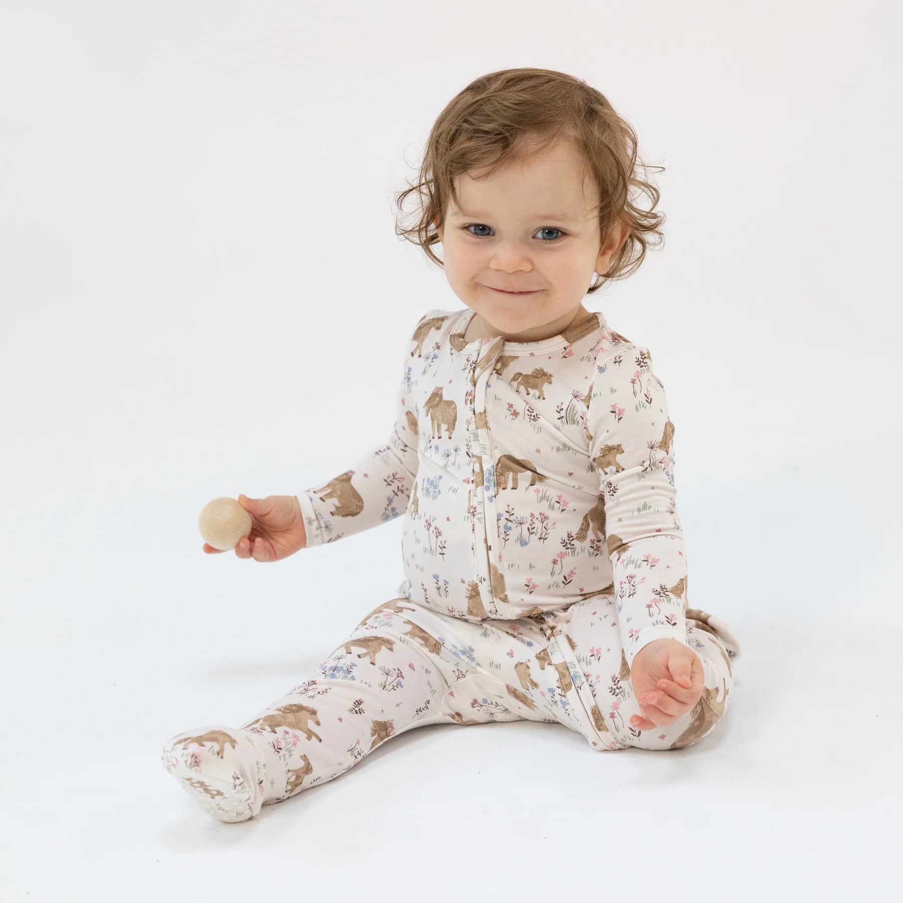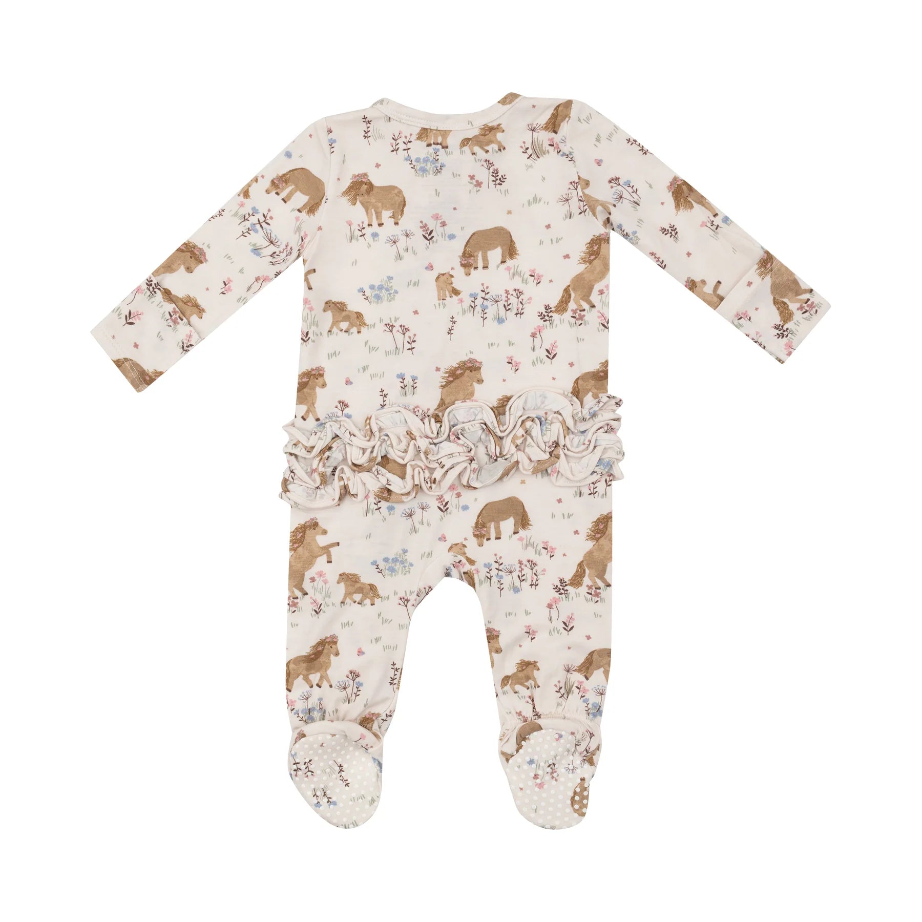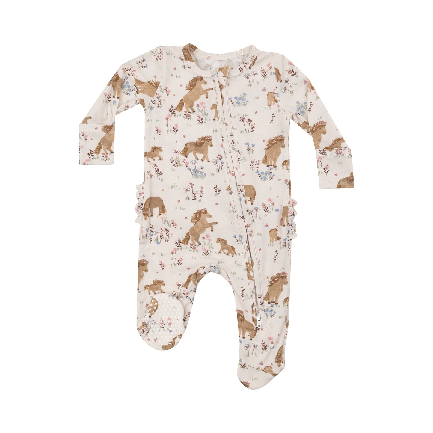 Ponies and flowers adorn this adorable ruffle-back footie pajama. Angel Dear's signature footie features: