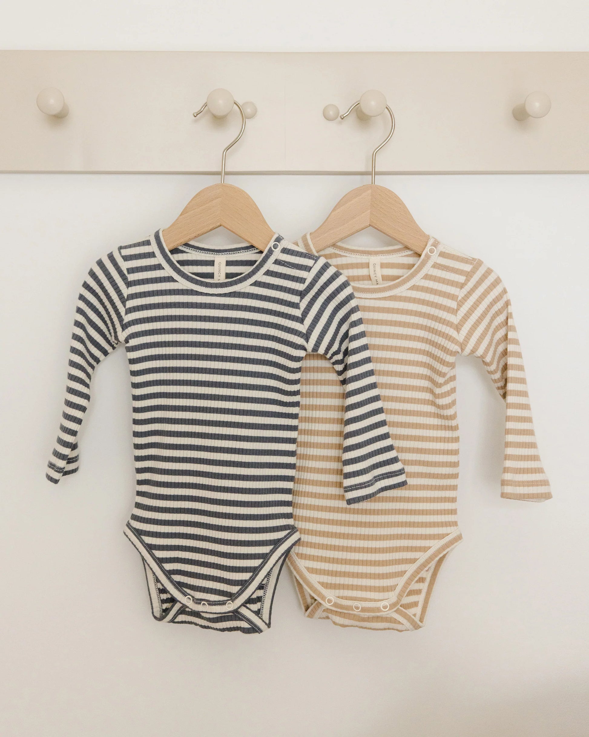This long sleeve onesie set comes in a stretchy rib knit. It has a slim fit with added stretch to grow with your baby. All sizes have snaps at shoulder and along inseam for easy changing.