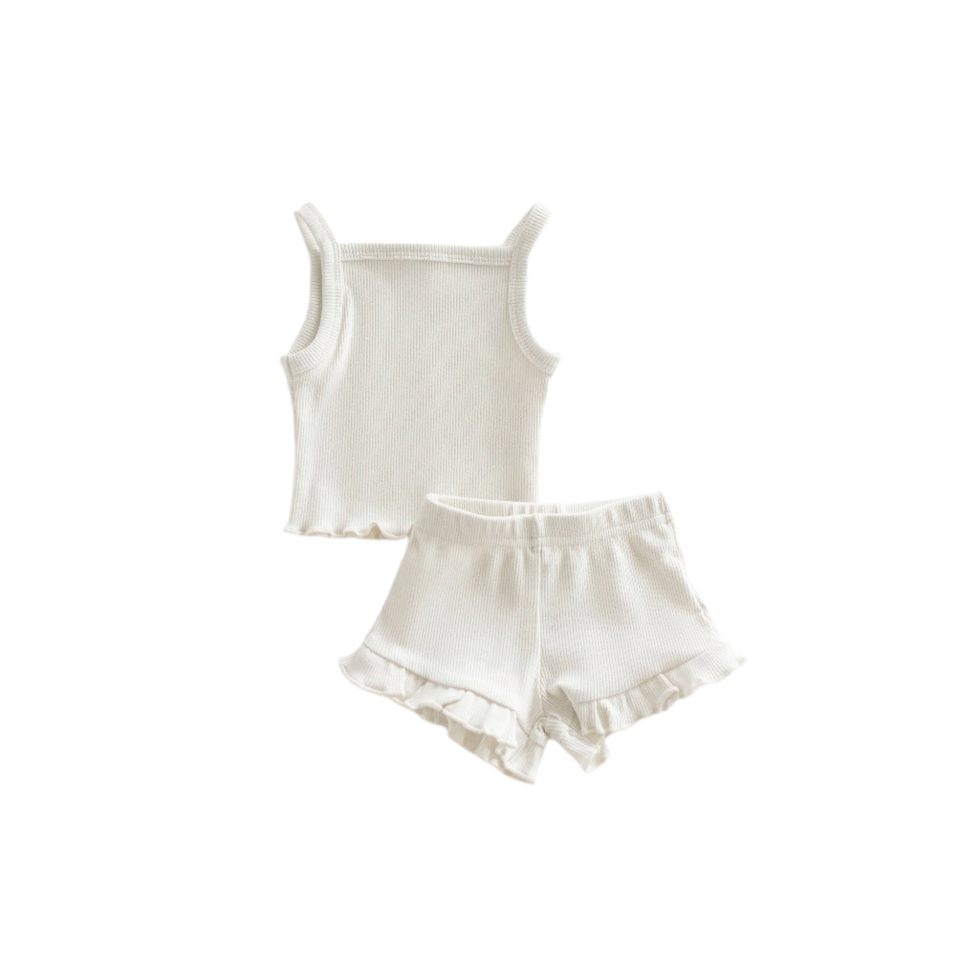 A perfect outfit for sunny days, the ribbed tank top & short set is a beautiful off white "seashell" color. The lettuce edge and ruffles add to the sweetness of this comfortable set.
