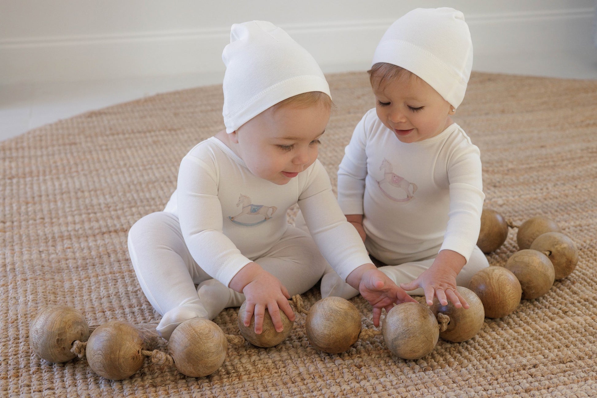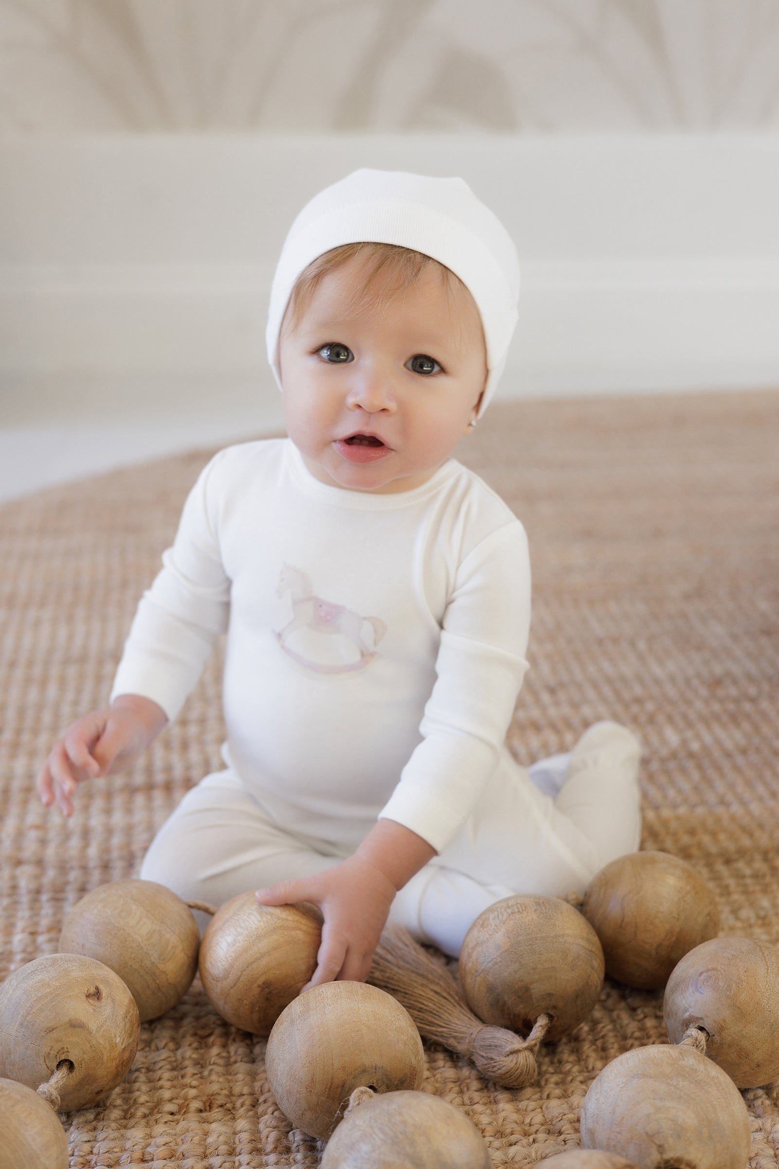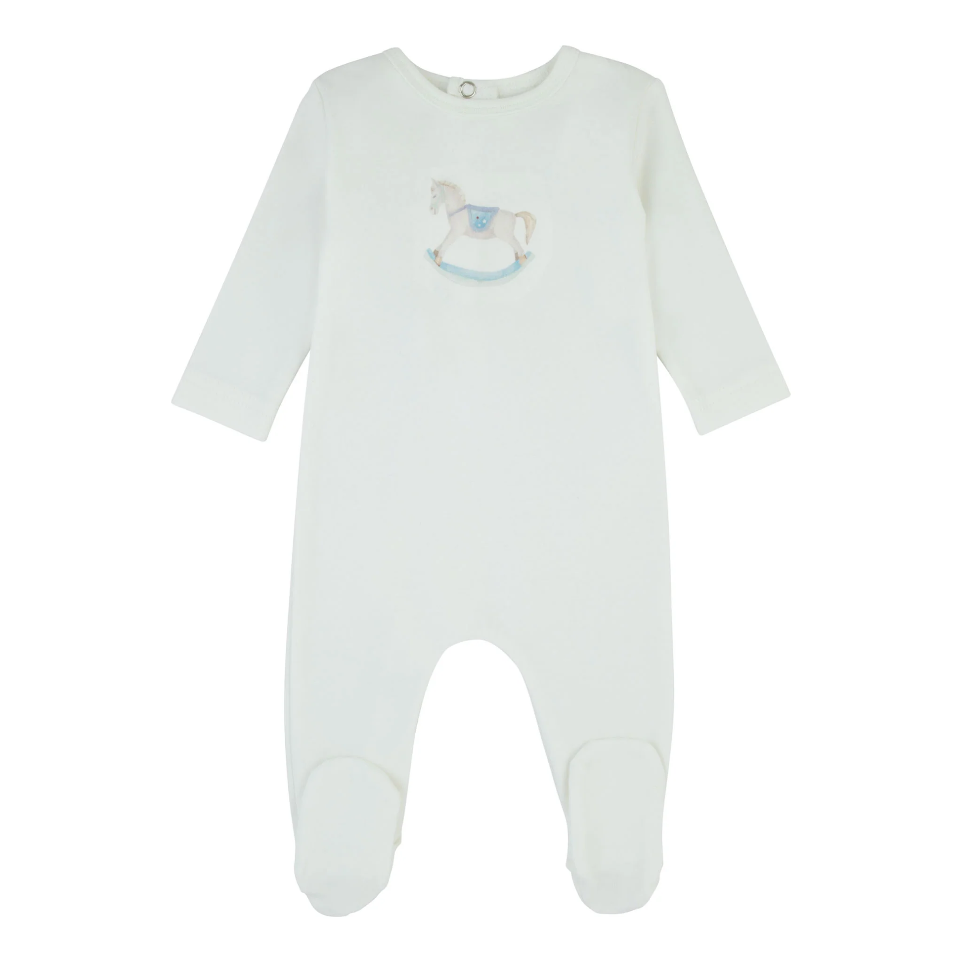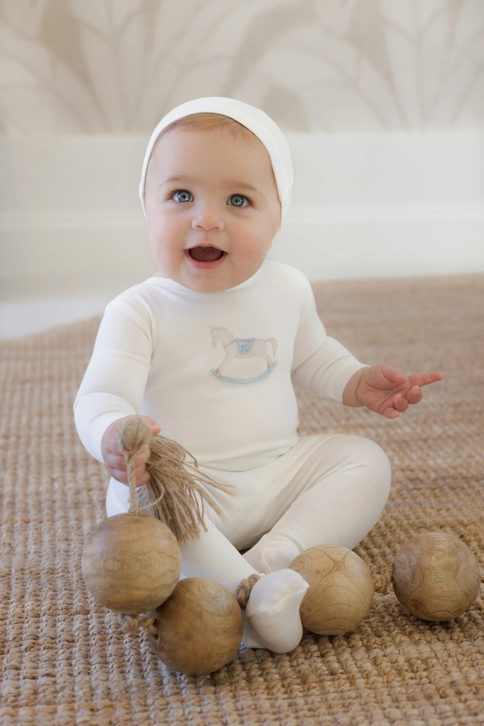 The Rocking Horse Footie is a delightful one-piece romper available in both pink and blue, designed to keep your baby comfortable and stylish. Crafted from soft, breathable bamboo fabric, it features a charming rocking horse print that adds a playful touch to your baby's wardrobe. The footie includes built-in footies to keep tiny toes warm and secure. For easy dressing, the footie is equipped with snap closures along the front and legs.