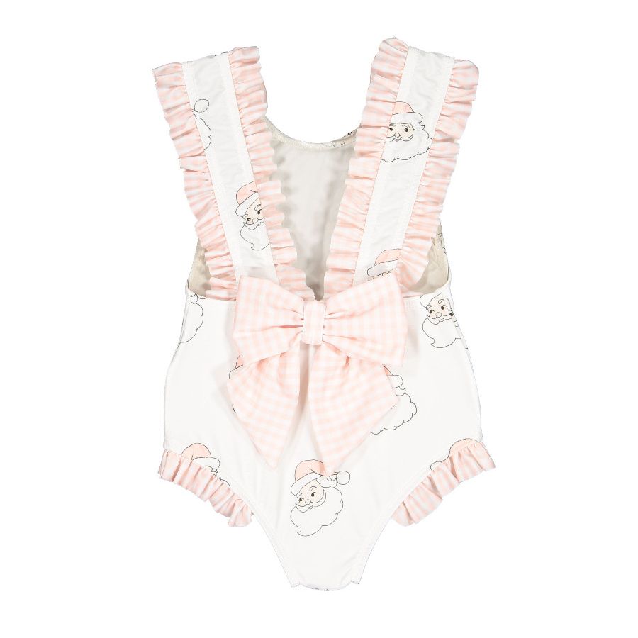 Celebrate the holidays with the Sal & Pimenta Girls Swimsuit. It features a pink Santa print on a crisp white backdrop and is designed with ruffles and bow details for an extra touch of charm.