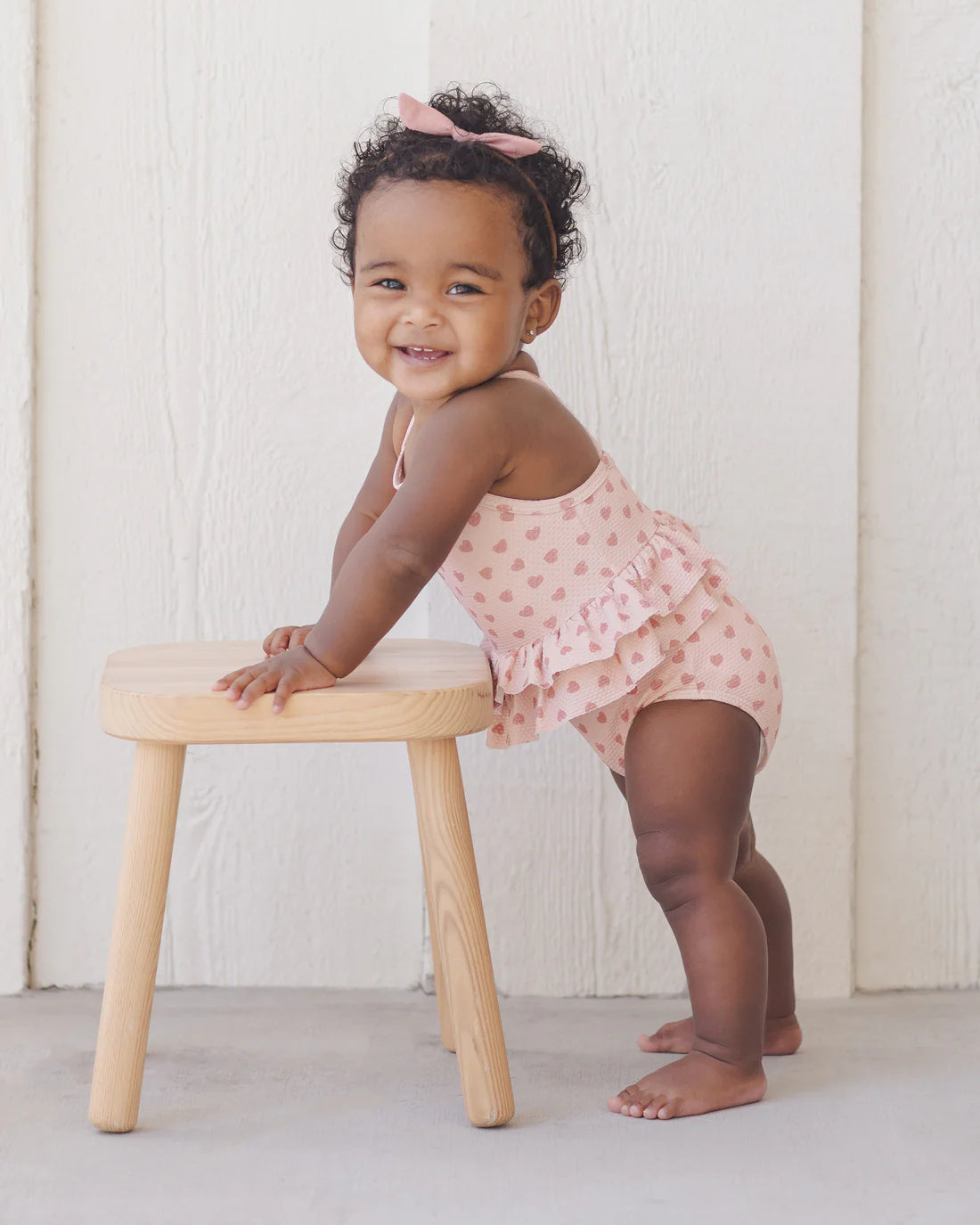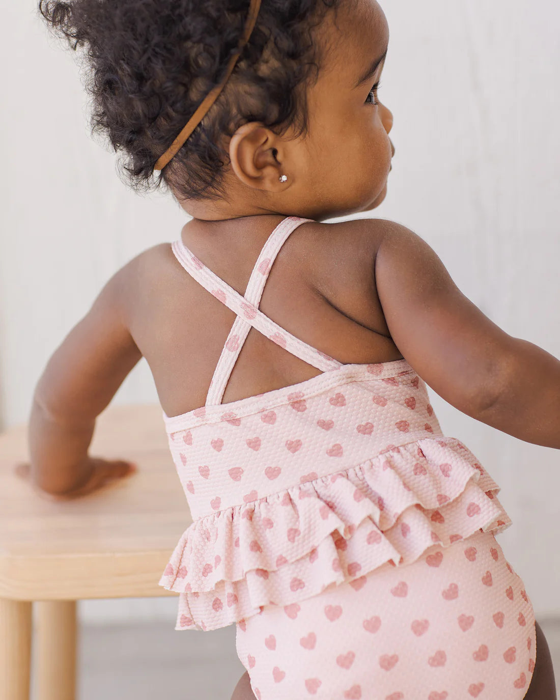 A sweet and sun-safe one-piece swimsuit for babies and toddlers, featuring a playful heart print, double ruffle skirt, and criss-cross straps in cheerful bubblegum pink.