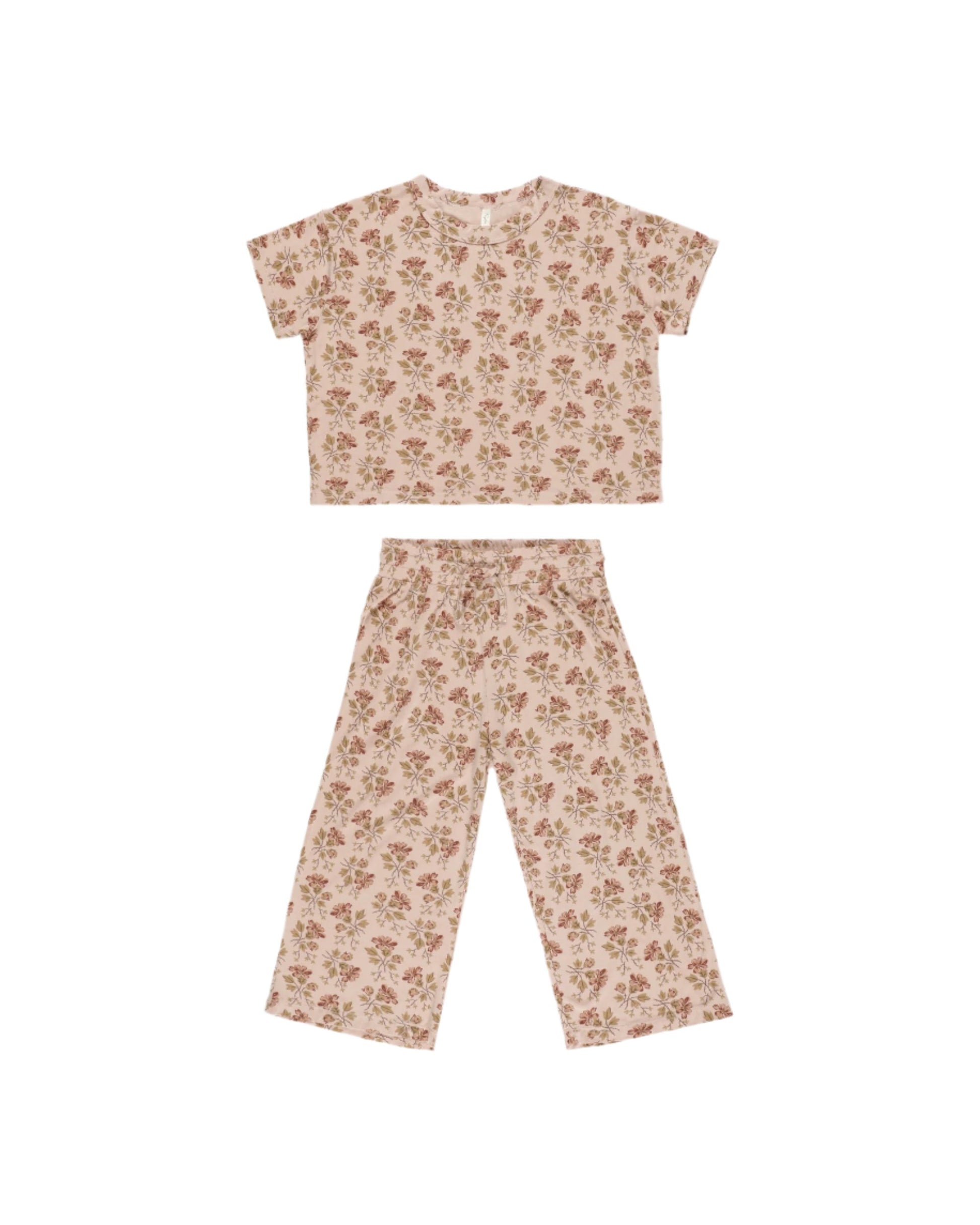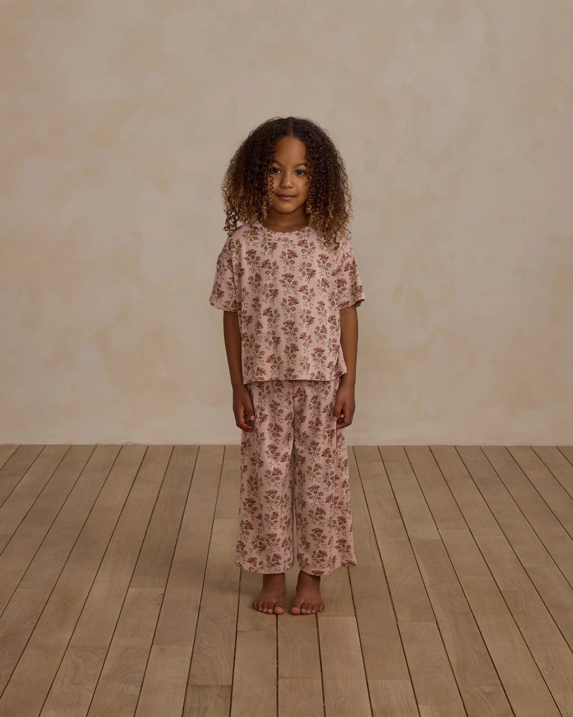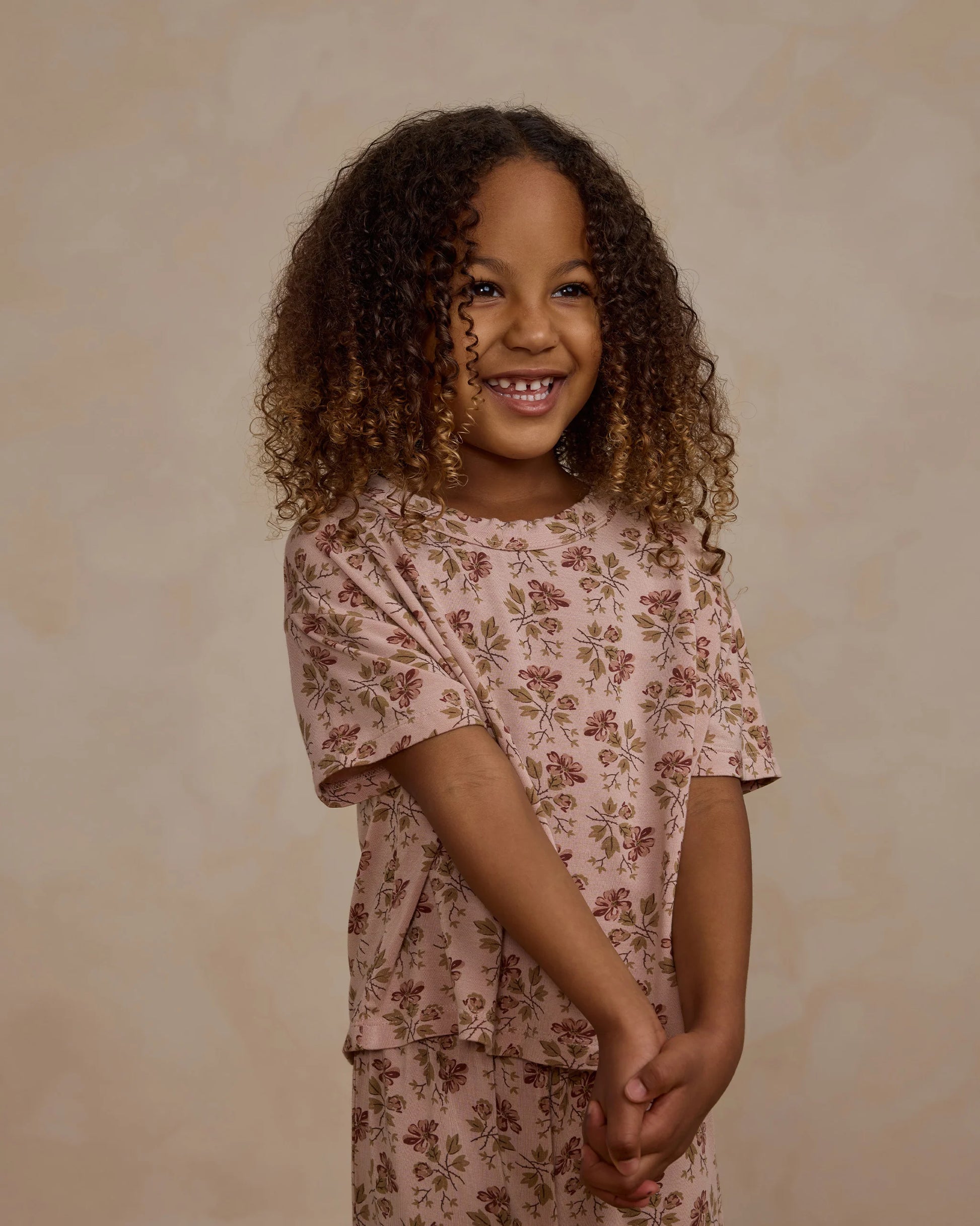 This super soft set includes a short sleeve top and cozy pants. The top has a relaxed fit, and the pants have an elasticized waistband. They feature a beautiful French garden pattern on a blush background.