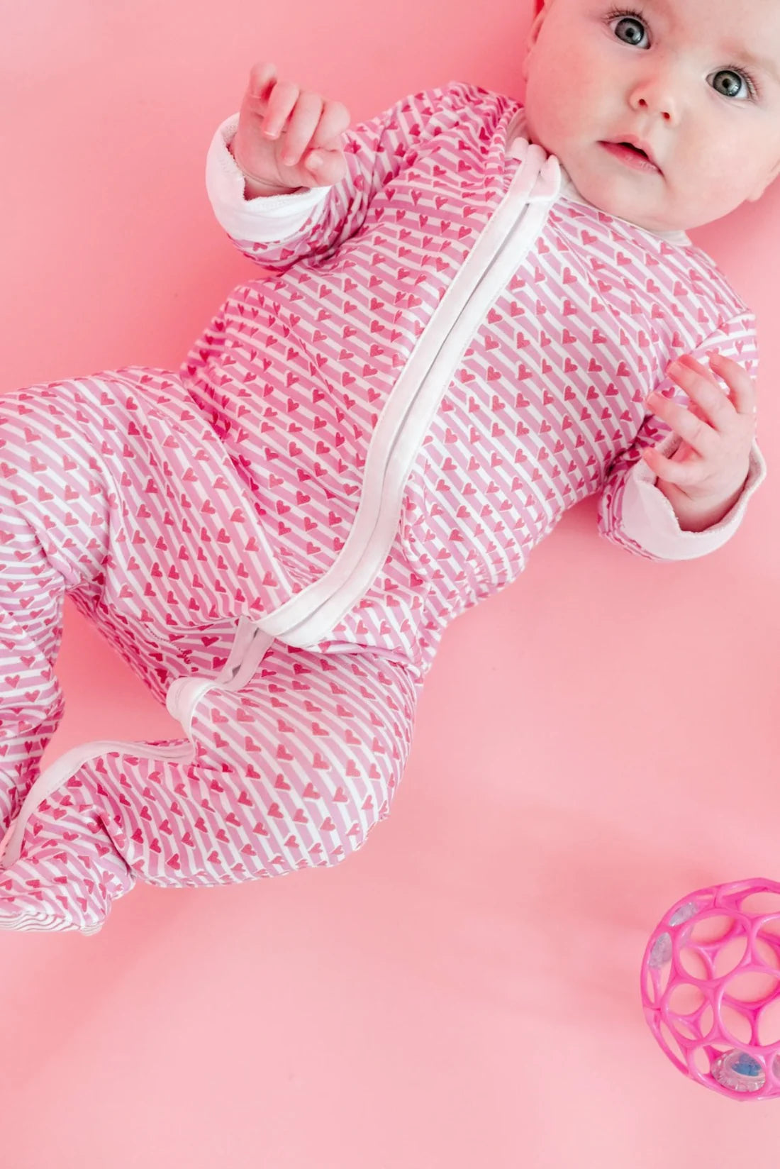 This beautiful print is a combination of two of our favorite things - stripes and hearts, because who doesn't love a bit of print on print? These zippered footie pajama will help fill hearts with love this Valentine's Day and beyond.