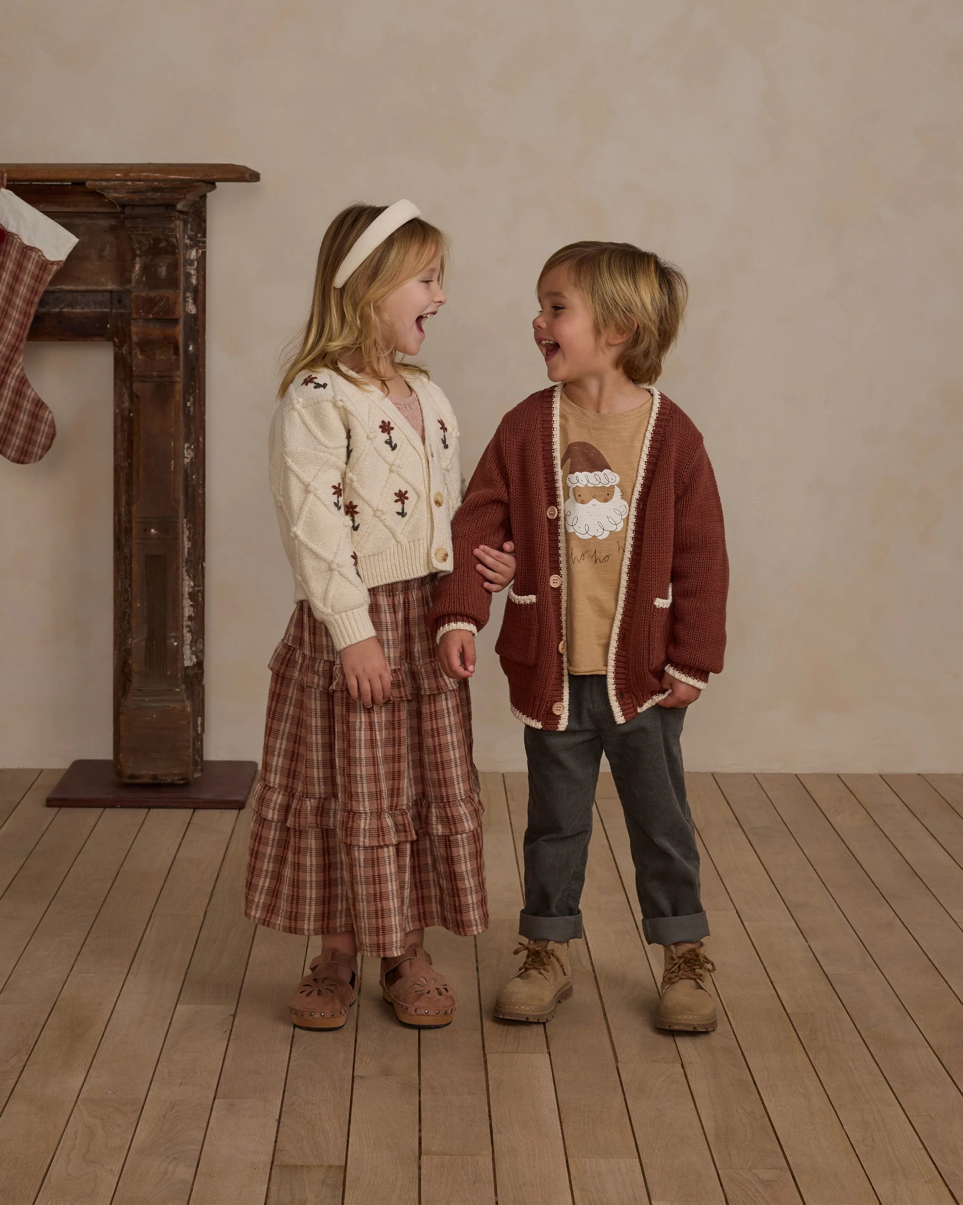 Get your little one holiday-ready with this beige-brown Santa long sleeve tee, featuring a playful "Ho Ho Ho" design. Made from soft cotton slub fabric, this boxy-fit tee offers ultimate comfort with a touch of edgy flair, thanks to its raw finished hemline. Baby sizes (0-3M through 18-24M) are thoughtfully designed with shoulder snaps for easy changing, making it as practical as it is festive. Perfect for cozy holiday vibes!