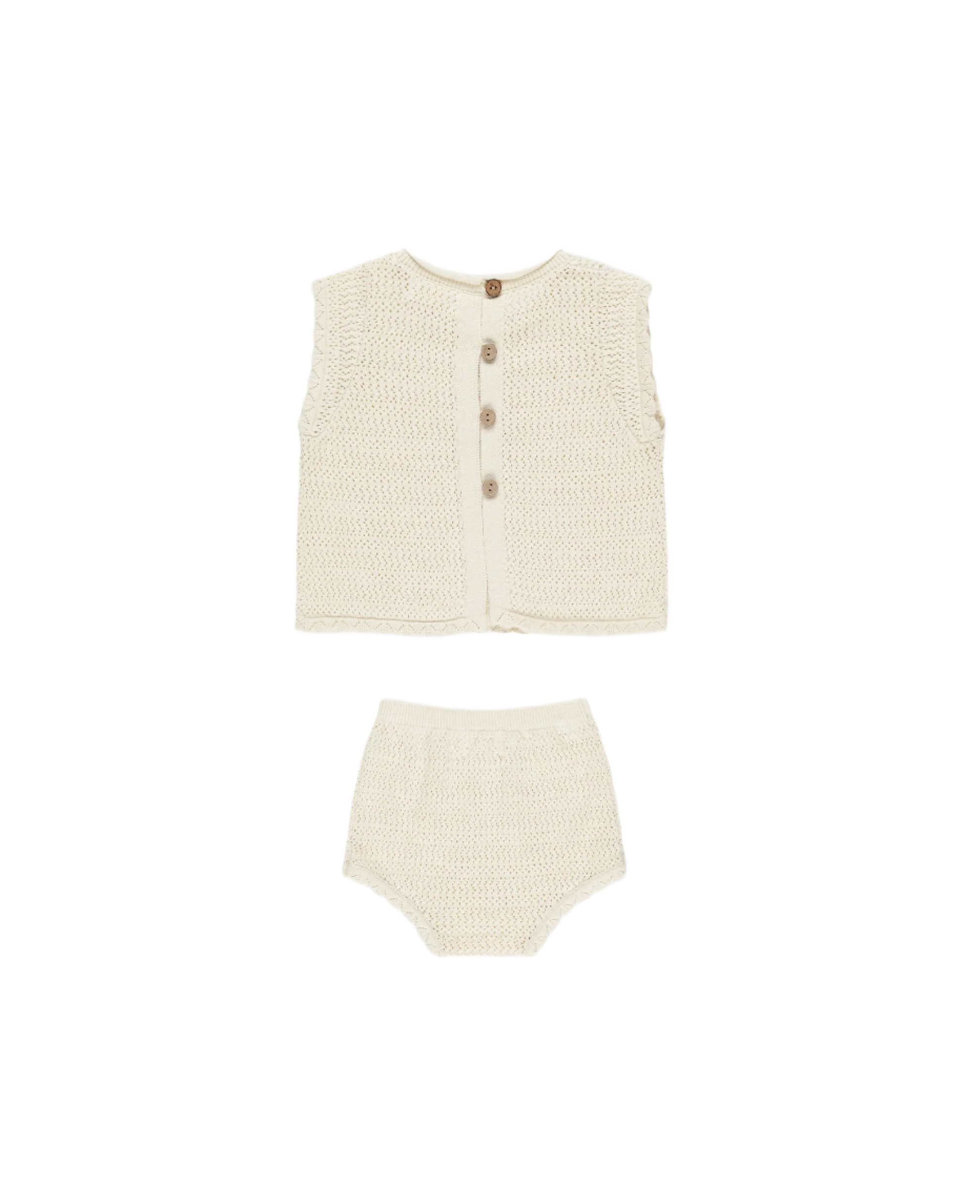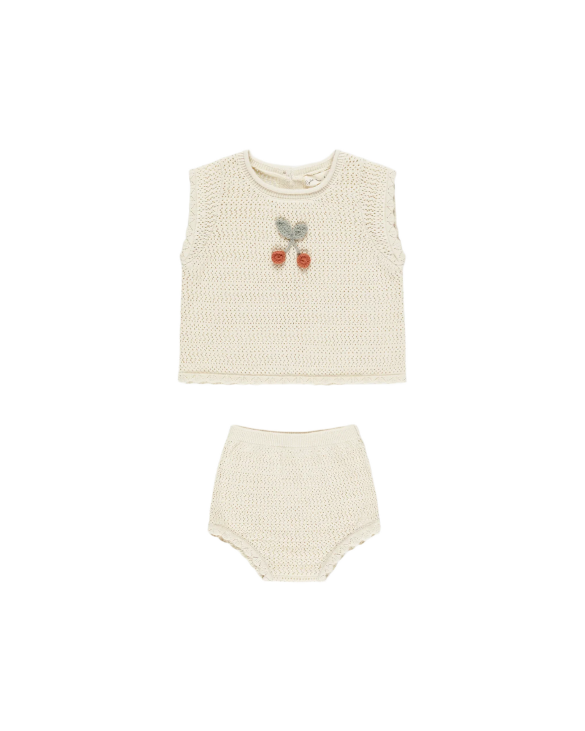 The Scallop Knit Baby Set in Cherry from Rylee and Cru is the perfect blend of comfort and style for summer. Crafted from soft, breathable fabric, this set features a cute scalloped knit design in a toned beige color. The stretchy material ensures a comfortable fit, while the lightweight fabric keeps your little one cool all season long.