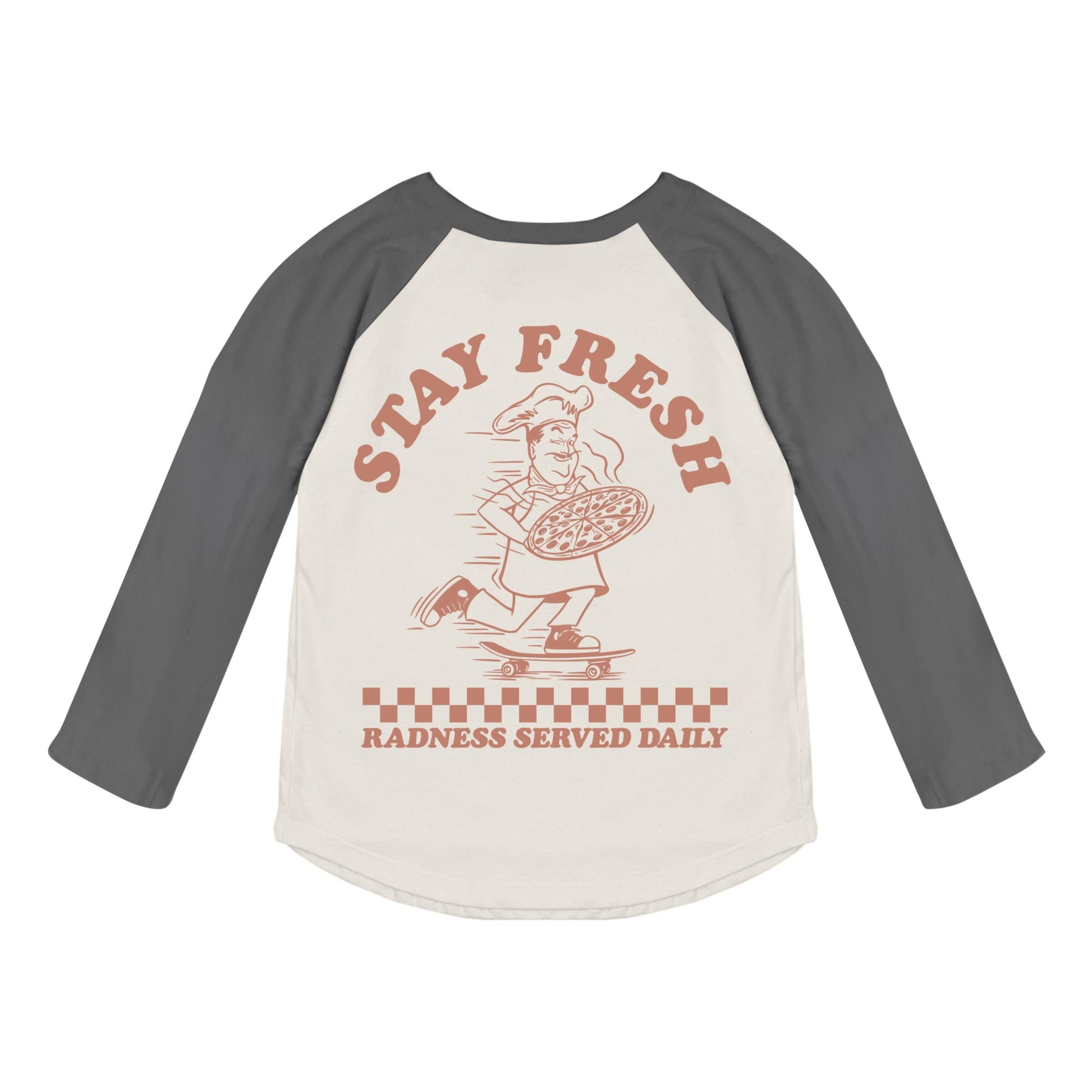 Stay fresh, cool, and comfortable in this cotton raglan tee. This long sleeve shirt features a unique design on the front and back, with vintage black sleeves for a touch of retro style. Ideal for pizza parties. ;)