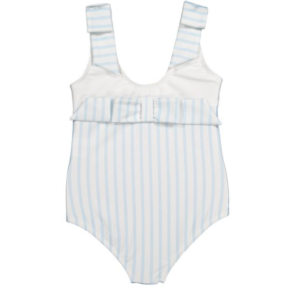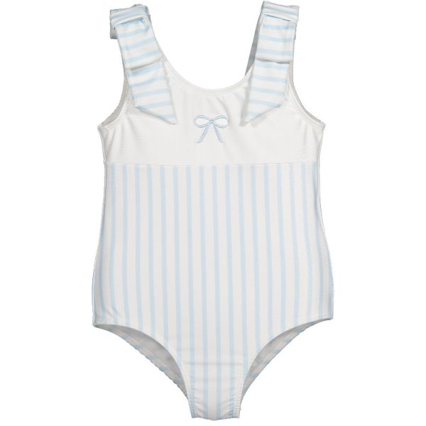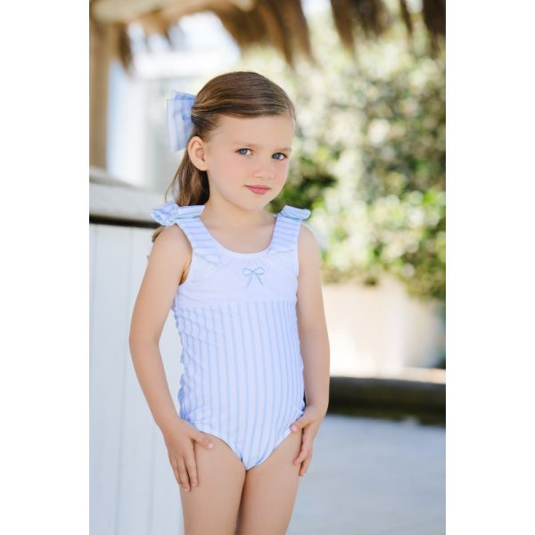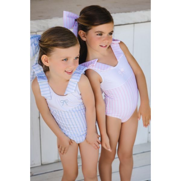 The Stripes Blue Swimsuit is a timeless one-piece designed for young fashionistas. Crafted from soft, breathable fabric, it offers both comfort and style. The classic blue and white stripes, combined with delicate frilled straps and a charming bow, create a look that's both playful and elegant. Ideal for beach outings or poolside fun, this swimsuit ensures your child stands out with grace.