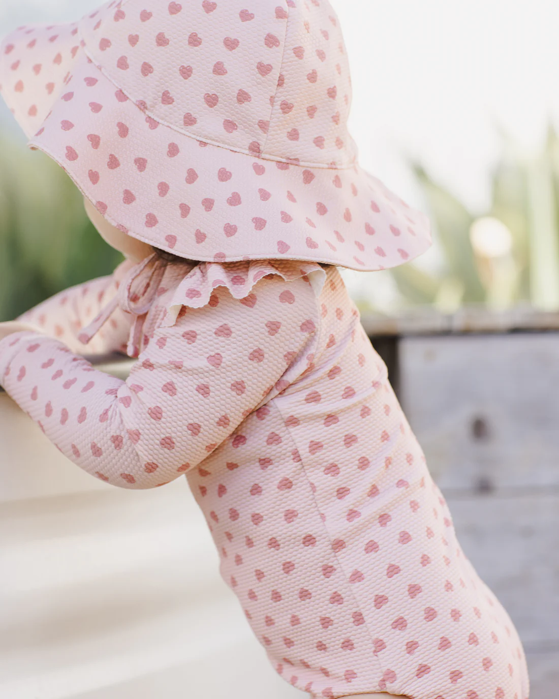 This baby Heart Print Sun Hat with UPF 50 Protection offers stylish sun safety for your little one. Featuring a soft, breathable fabric with an adorable heart print, this lightweight hat provides excellent coverage with its wide brim. Designed for comfort, it includes adjustable chin ties to ensure a secure fit. Perfect for sunny outings, beach days, and everyday adventures, this hat keeps your baby cool and protected while adding a sweet touch to any outfit.