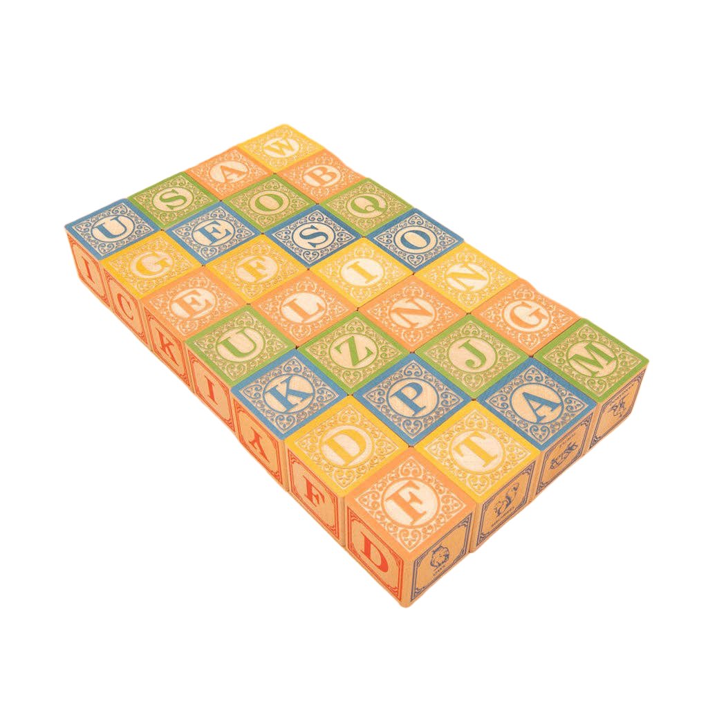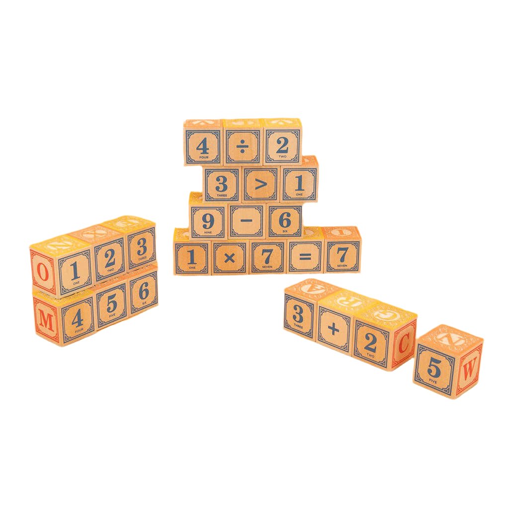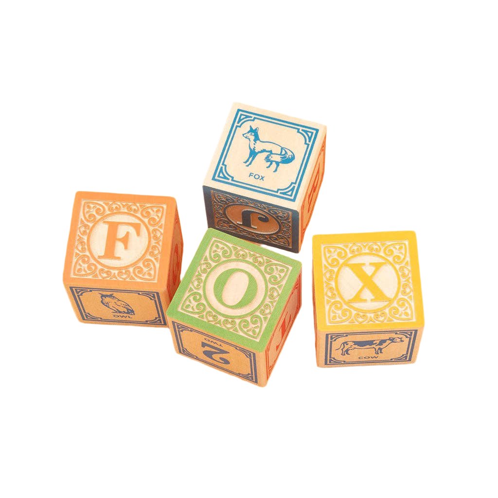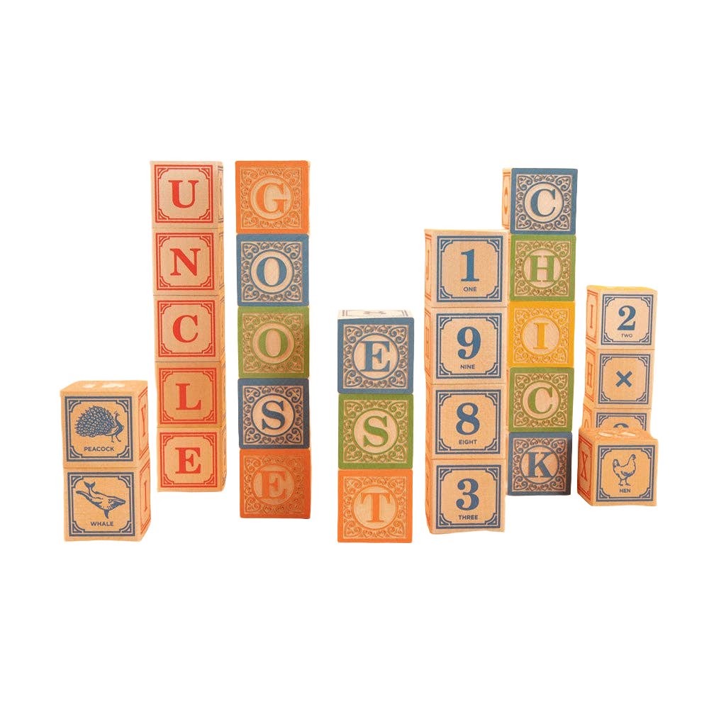 Teach children to spell, sequence, stack, sort, build, and match with these colorful embossed wooden blocks. Each set include four full alphabets, colorful numbers, math symbols, plus a menagerie of hand-crafted animals.