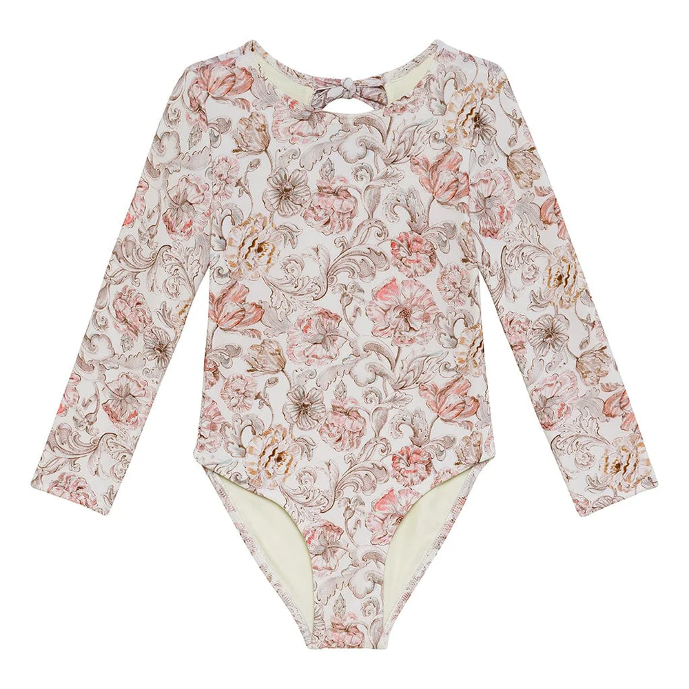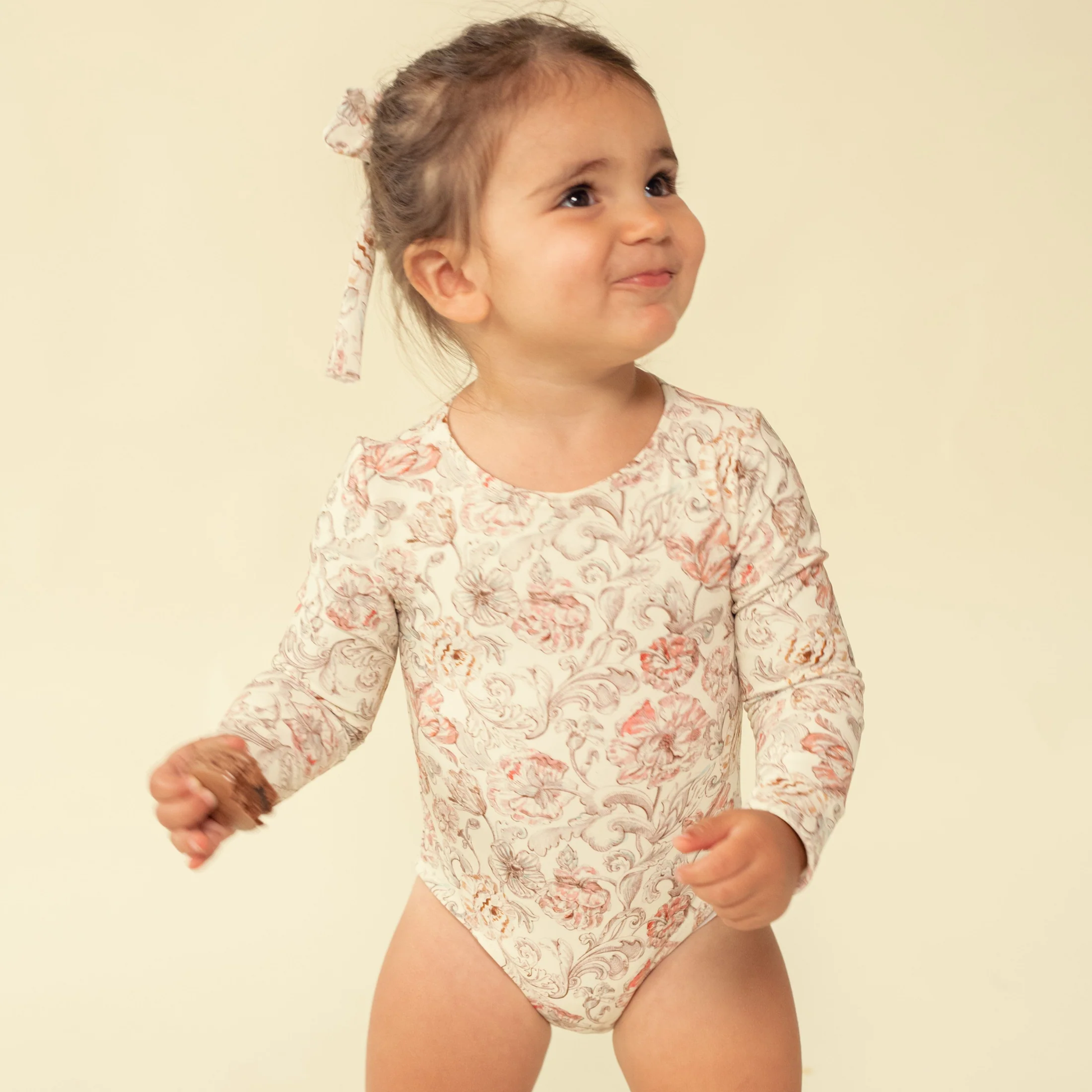 Sweet, stylish, and sun-safe — the Venecia Floral Mini Long Sleeve One-Piece is a beautiful blend of function and fashion for your little one's beach or poolside adventures. Featuring a vintage-inspired floral print in soft rose, cream, and taupe tones, this timeless swimsuit is made from premium, quick-drying fabric with built-in UPF protection.