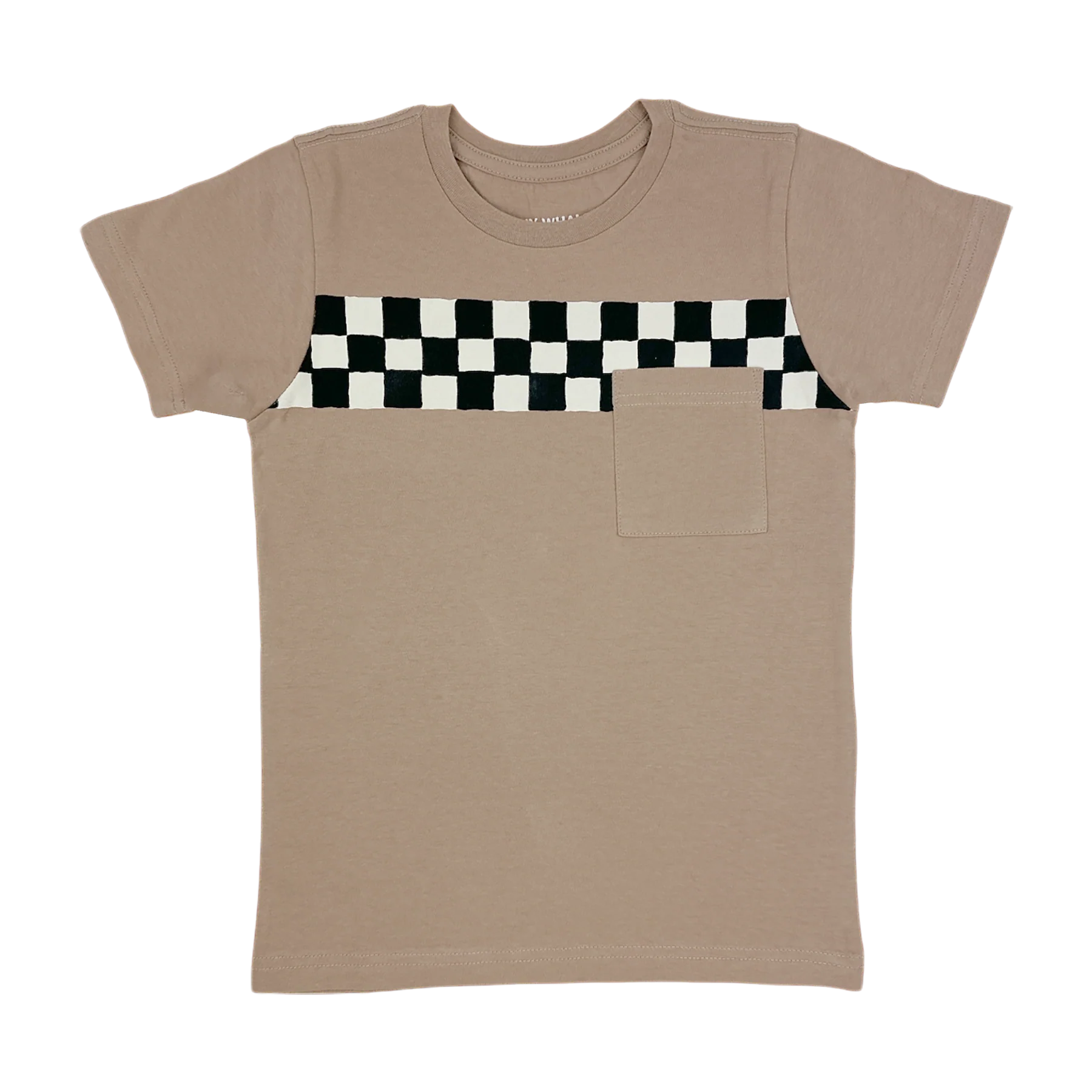 Keep your little one looking cool and feeling comfy with our Vibe Check Camel T-Shirt for babies and toddlers! This stylish short-sleeve tee features a bold black-and-white checkerboard stripe across the chest, set against a warm camel background. Whether you're headed to a playdate, the park, or a family outing, this toddler t-shirt is a go-to pick for easy, everyday style.
