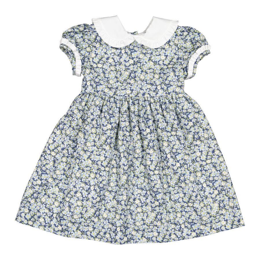 This elegant dress is a beautiful piece that is perfect for special occasions. It has a timeless winter daisies floral print, ruffle collar details, ruffle at the sleeves, and ties in the back. It has a coordinating little sister romper, bow, and headband.